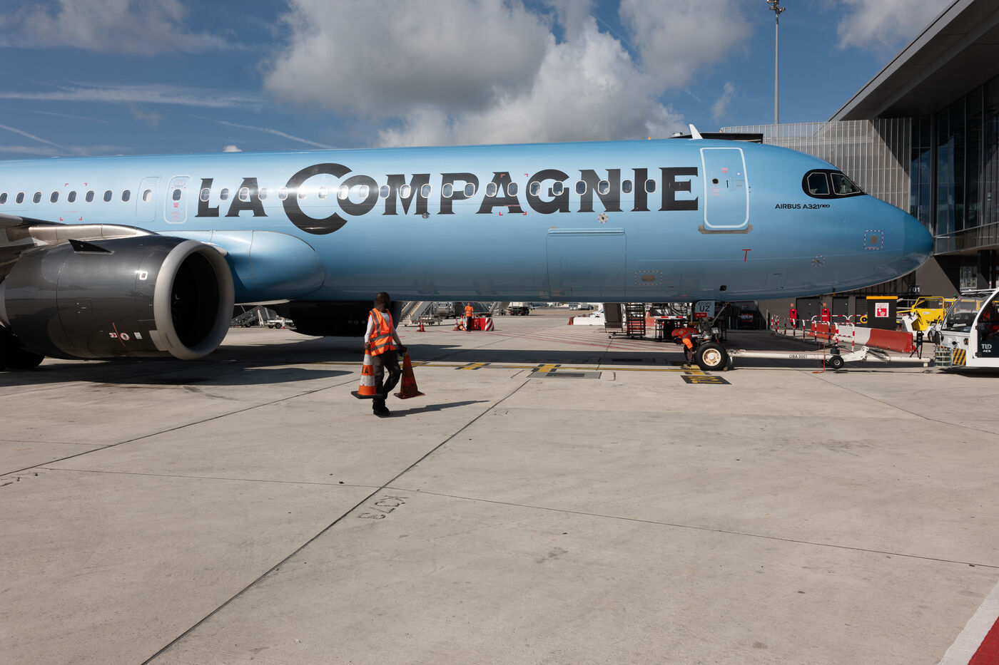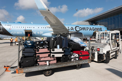 Suivons les valises depuis l'enregisterment du vol La Compagnie vers New-York depuis l'enregistrement jusqu'à la soute de l'avion.