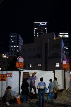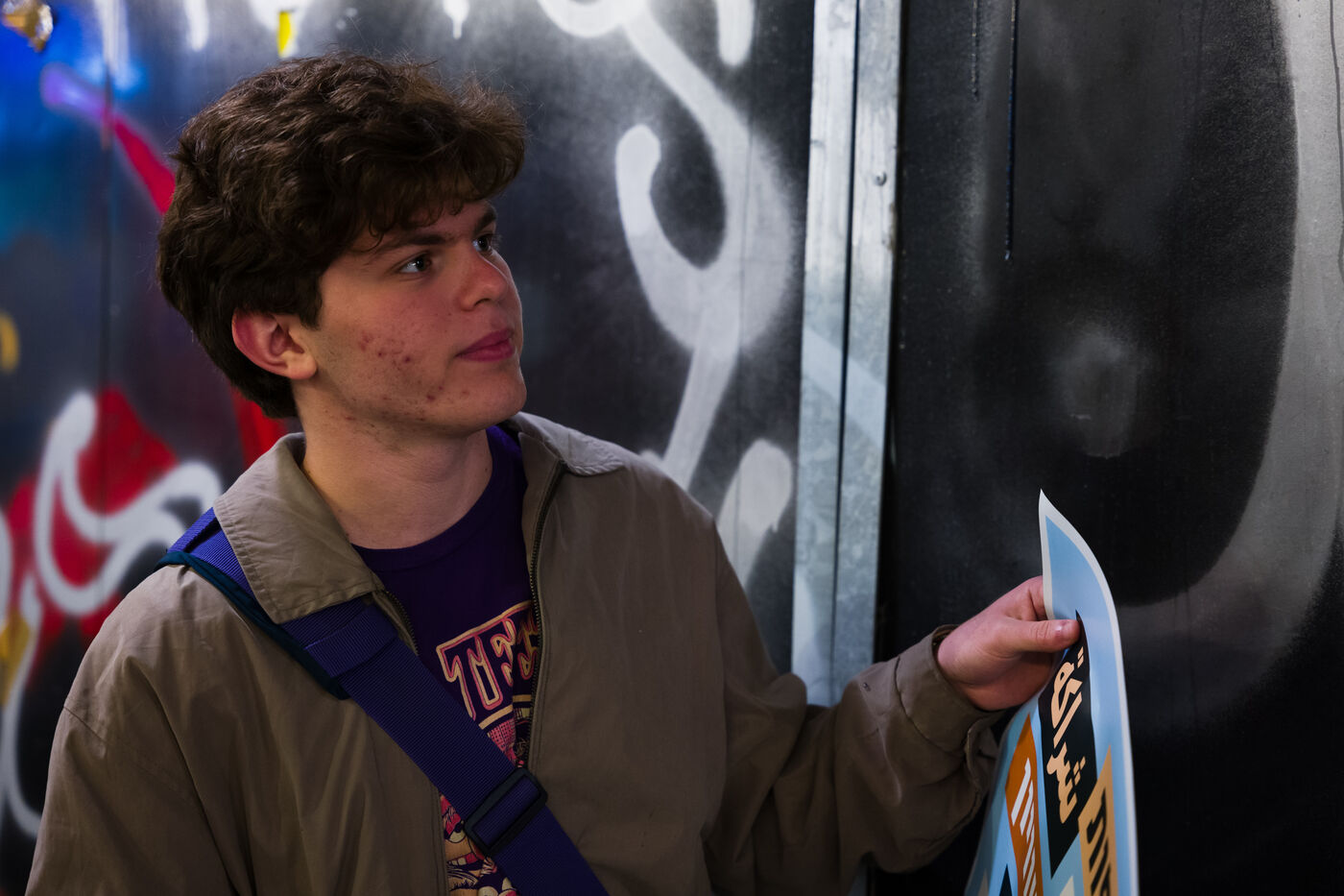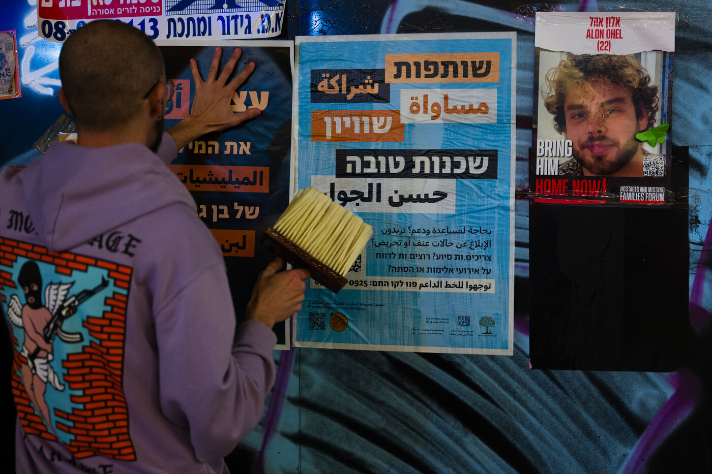 Left activists paste posters in Tel-Aviv Streets. No to racism, no to violence, Tel-Aviv Yaffo is for everyone. Stop the militias od Ben Gvir and Ha-Tzel. Partnership, equality and neigbourghness.