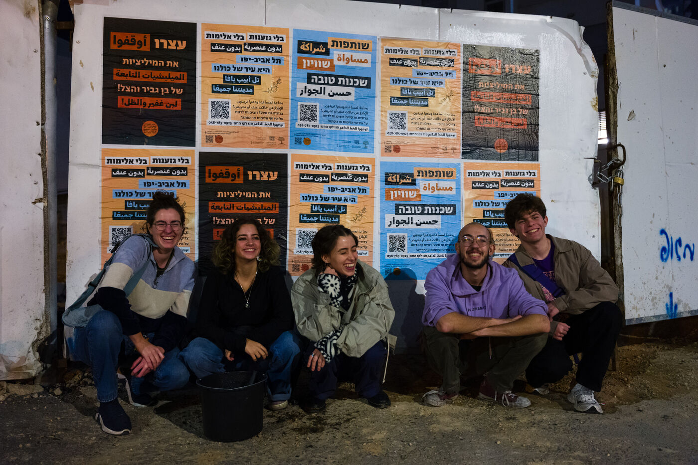 En Israel, suite aux attaques terroristes du Hamas le 7 octobre, de jeunes activites de gauche collent des affiches dans les rues de Tel-Aviv. Non au racisme, non a la violence, Tel-Aviv Yaffo appartient a tous. Stop les milices de Ben Gvir et Ha-Tzel. Partenariat, egalite et voisinage.