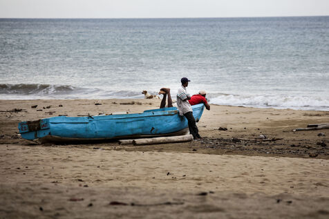 Sur la plage, les proches restés sur terre scrutent l'horizon, les chiens excités sentent le retour imminent des pêcheurs. Les hommes s'activent pour sortir leurs bateaux de l'océan atlantique en s'aidant de rondins de bois. Une fois débarqués, rapidement ils déchargent leur cargaison de poissons frais pour les nettoyer sur des tables en bois sur la plage et les proposer à la vente dans des cabanons à proximité. Toute une chorégraphie bien rodée se met en place, les plus jeunes et les plus vigoureux poussant les lourds bateaux, les plus anciens donnant leurs consignes. La solidarité entre confrères reste de mise. Certains produits, rares et précieux, comme le crabe royal appelé ici Santoyo, sont réservés avant la pêche et on vient les récupérer directement au plus près des barques. Les restaurants, les touristes et les autochtones seront tous rassasiés.