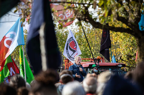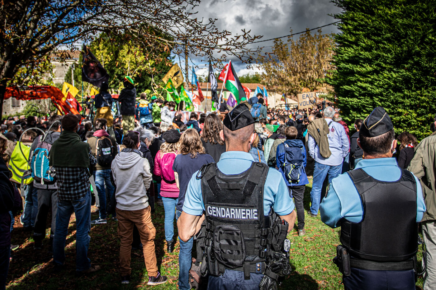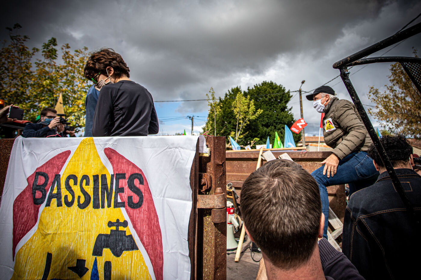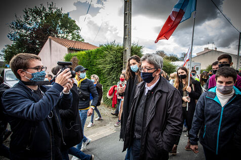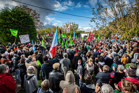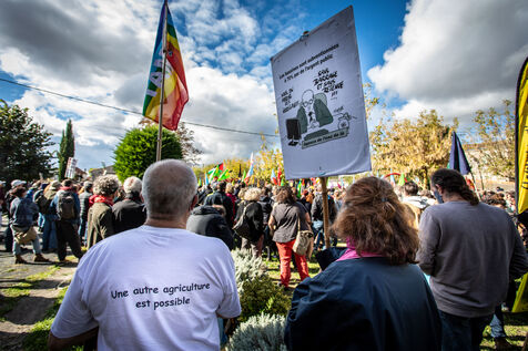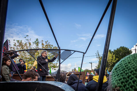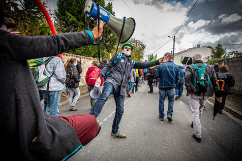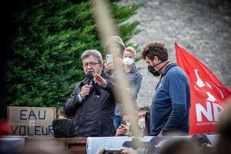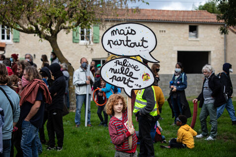 2800 people marched peacefully through the streets of Epannes in Deux-Sèvres, on the call of the Bassines Non Merci collective. Jean-Luc Mélenchon, leader of the political party La France Insoumise, Yannick Jadot, leader of the political party Europe Ecologie Les Verts, Philippe Poutou, leader of the political party le Nouveau Parti Anticapitaliste and José Bové, anti-globalization figure took to the microphone to denounce the megabasin projects, which they see as an environmental threat, on October 11, 2020.