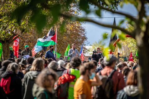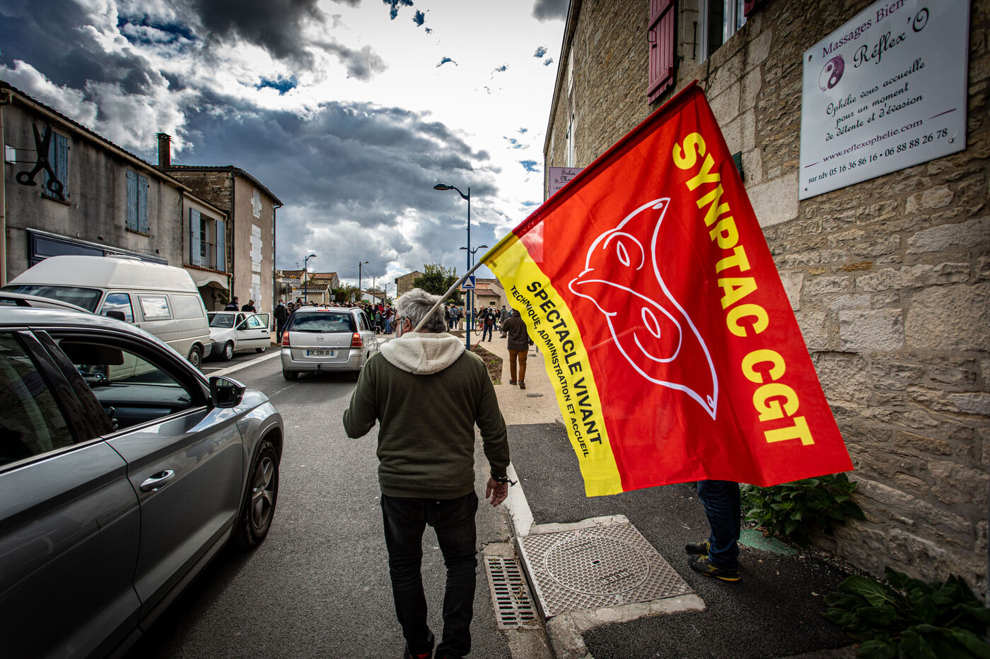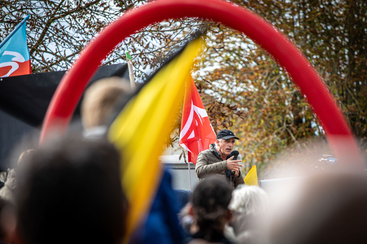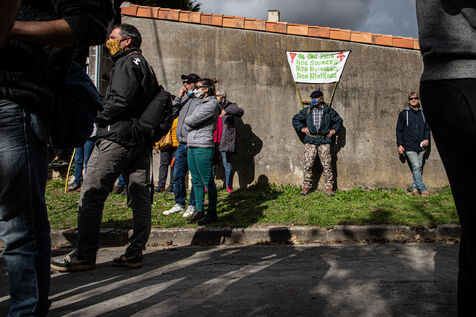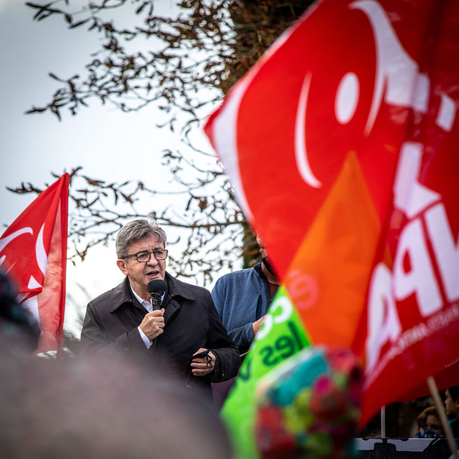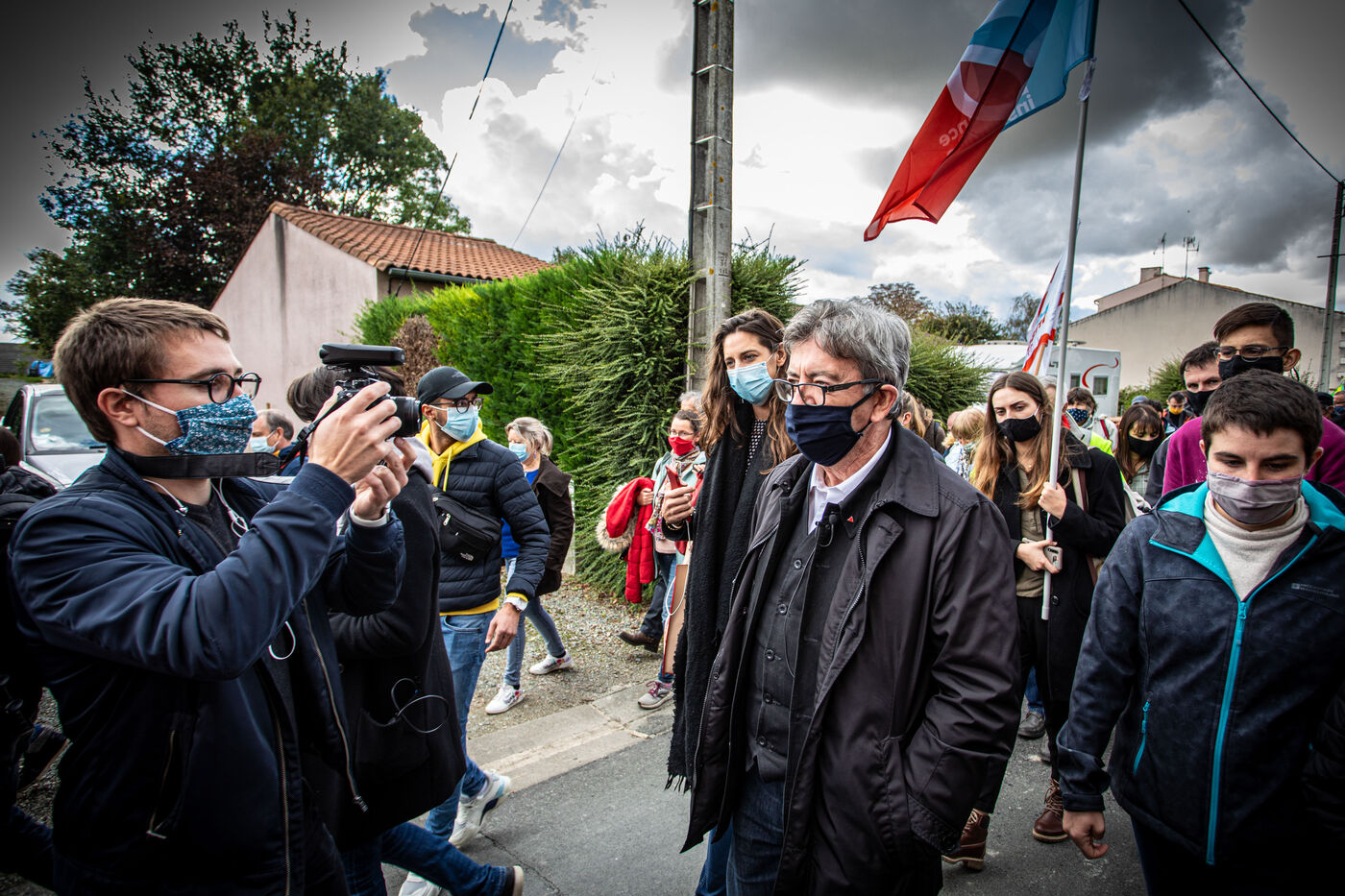 2800 people marched peacefully through the streets of Epannes in Deux-Sèvres, on the call of the Bassines Non Merci collective. Jean-Luc Mélenchon, leader of the political party La France Insoumise, Yannick Jadot, leader of the political party Europe Ecologie Les Verts, Philippe Poutou, leader of the political party le Nouveau Parti Anticapitaliste and José Bové, anti-globalization figure took to the microphone to denounce the megabasin projects, which they see as an environmental threat, on October 11, 2020.