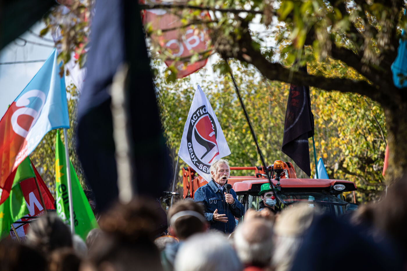 2800 personnes ont marché pacifiquement dans les rues d'Epannes en Deux-Sèvres, à l'appel du collectif Bassines Non Merci. Jean-Luc Mélenchon, leader du parti politique La France Insoumise, Yannick Jadot, leader du parti politique Europe Ecologie Les Verts, Philippe Poutou, leader du parti politique le Nouveau Parti Anticapitaliste et José Bové, figure altermondialiste se sont succédés au micro pour dénoncer les projets des mégabassines, menaces environnementales selon eux, le 11 octobre 2020.