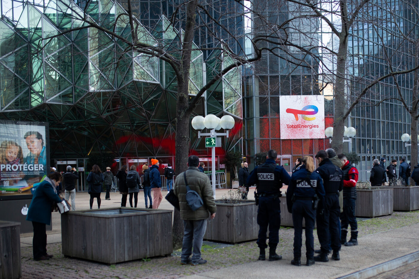 Action non violente devant le siège social de Total Energies organisé par Alternatiba et les Amis de la Terre à la Défense afin de dénoncer les super profits du groupe d'énérgie pendant que les coûts de l'énérgie augmentent. Celui-ci a engendré un bénéfice net de 20,5 milliards de dollars pour l'année 2022 tandis qu'un appel à la sobriété énérgétique est demandé aux Français.