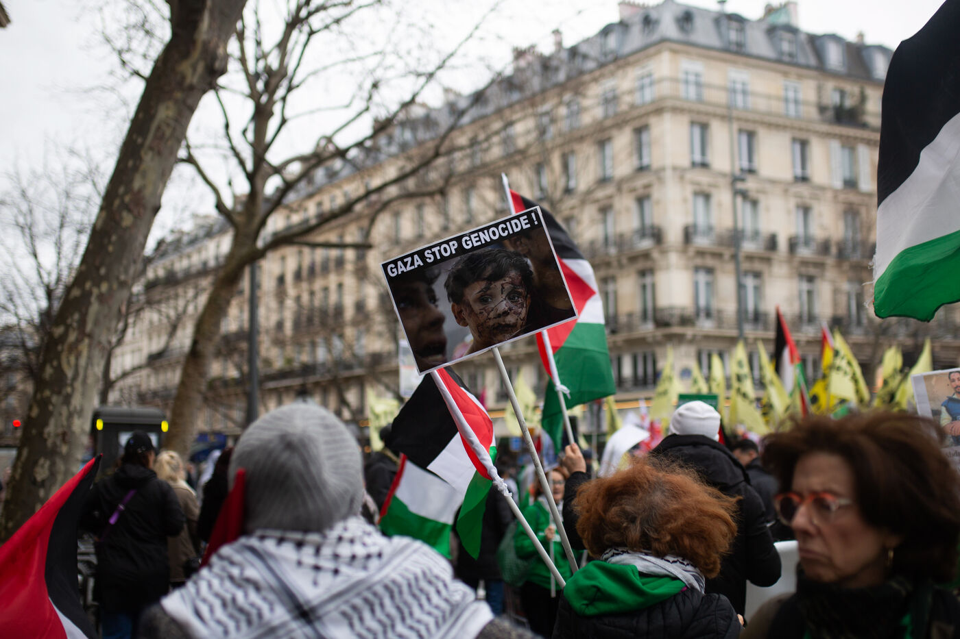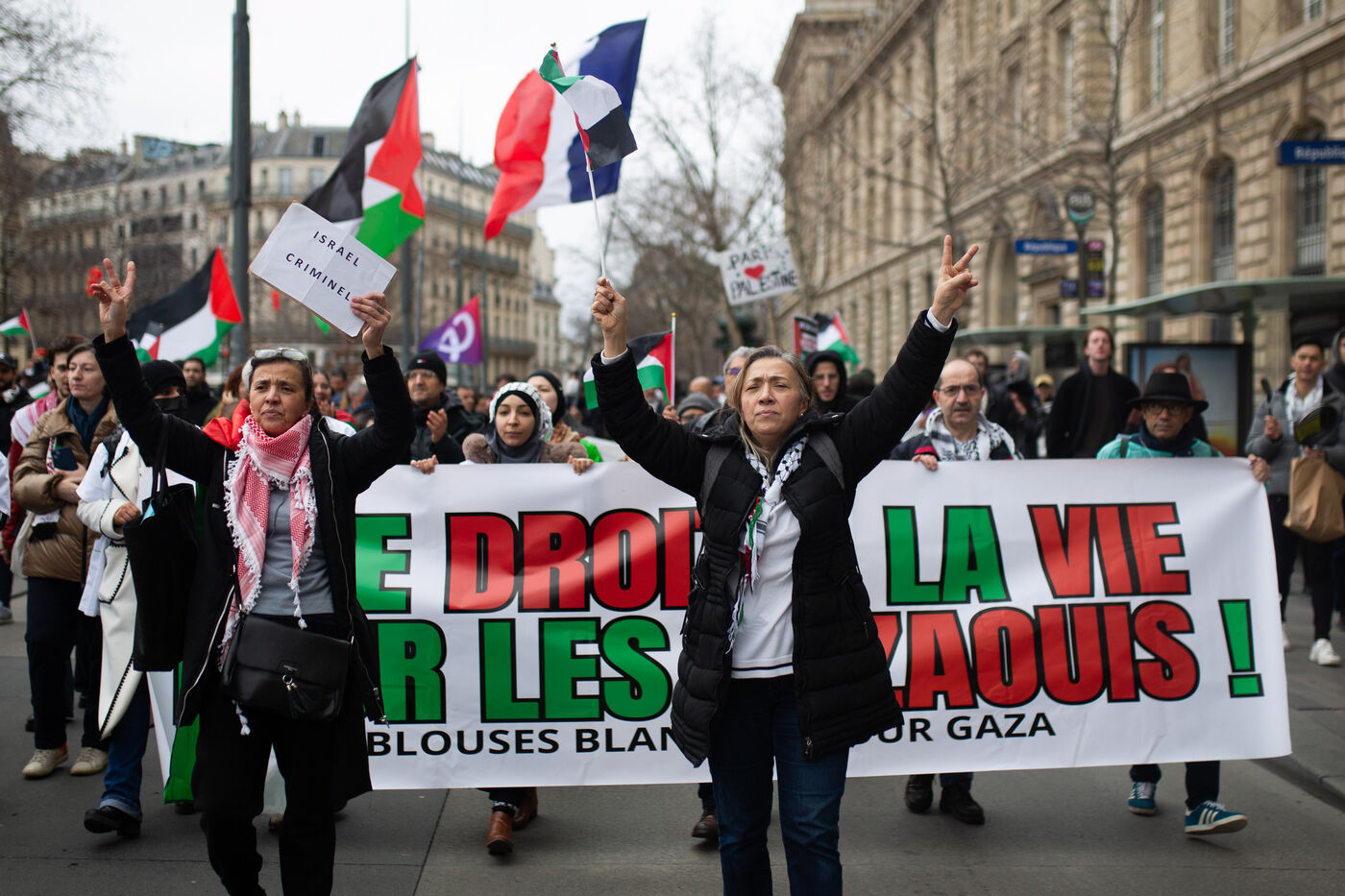 Several hundred demonstrators gathered at Place de la République to call for the repeal of the Darmanin law, and were joined by the procession for the Palestinians.