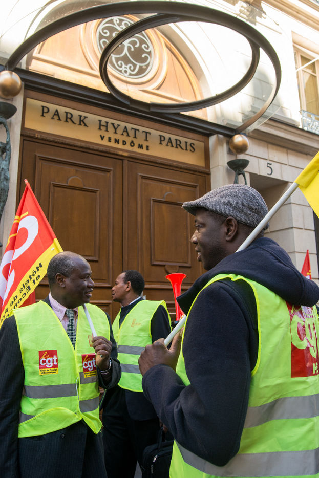 A protest by employees of the hotel and restaurant industry against subcontracting and precarious working conditions, parade from Hotel Park Hyatt Vendôme, to go to the Hyatt Madeleine, with a call to strike for Fashion Week . France, Paris, September 25, 2018.