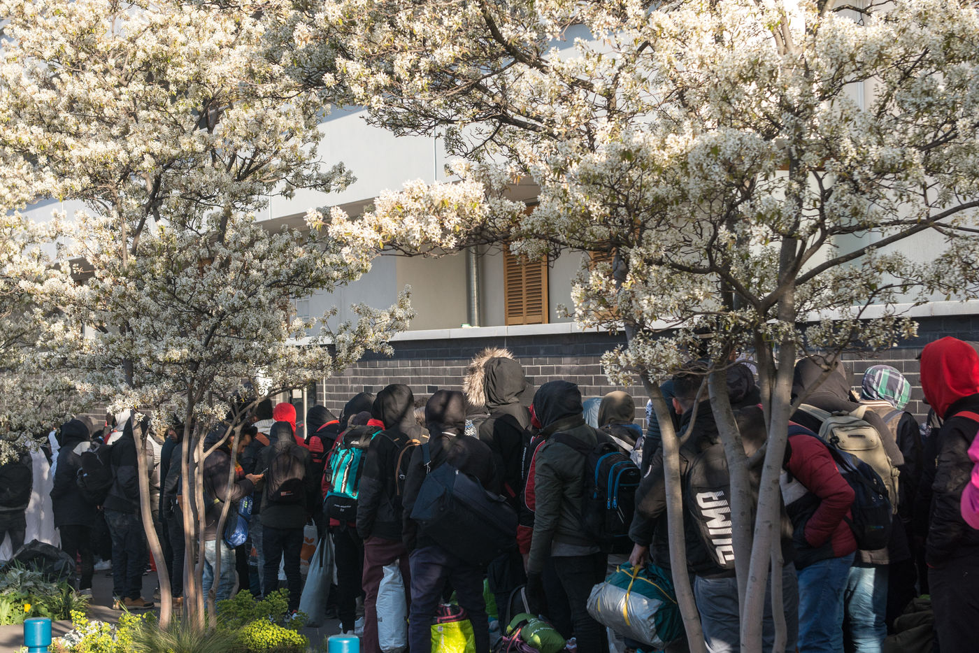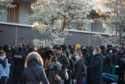 Évacuation du campement de migrants d'Aubervilliers le 24 mars 2020. Au 8ème jour du confinement en France lors de la pandémie de coronavirus, la préfecture évacue le campement de fortune où se trouvait plus de 500 personnes dormant dans des tentes.