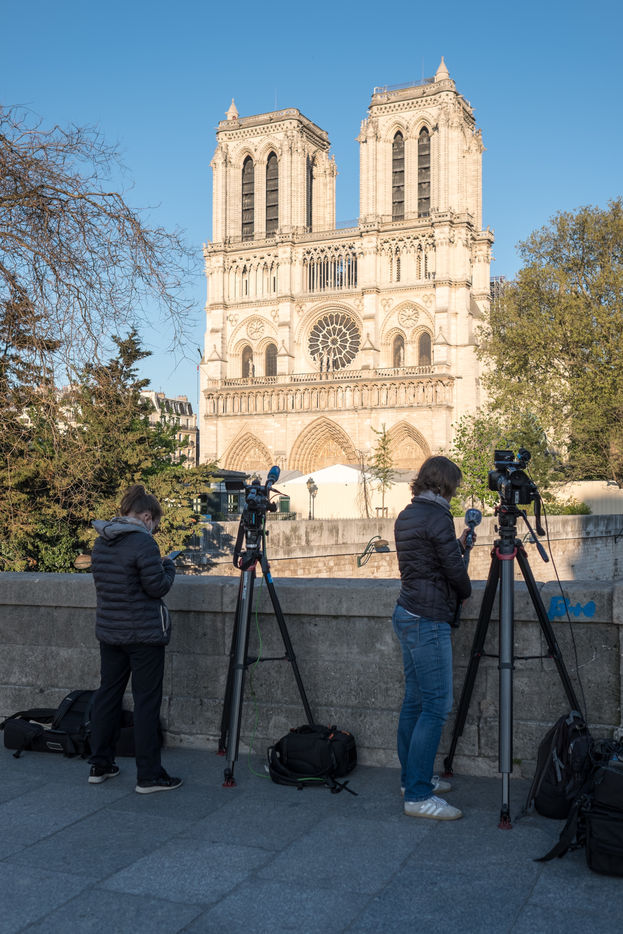 Quelques personnes se sont approchées près de la cathédrale pour applaudire et filmer la grande cloche qui résonne à 20 heures. Elle marque l'anniversaire de l'incendie de la cathédrale, au moment même où les Français applaudissent les soignants pendant cette période d'épidémie du coronavirus. Le recteur Patrick Chauvet répond à quelques interview avec la presse avant 20h.