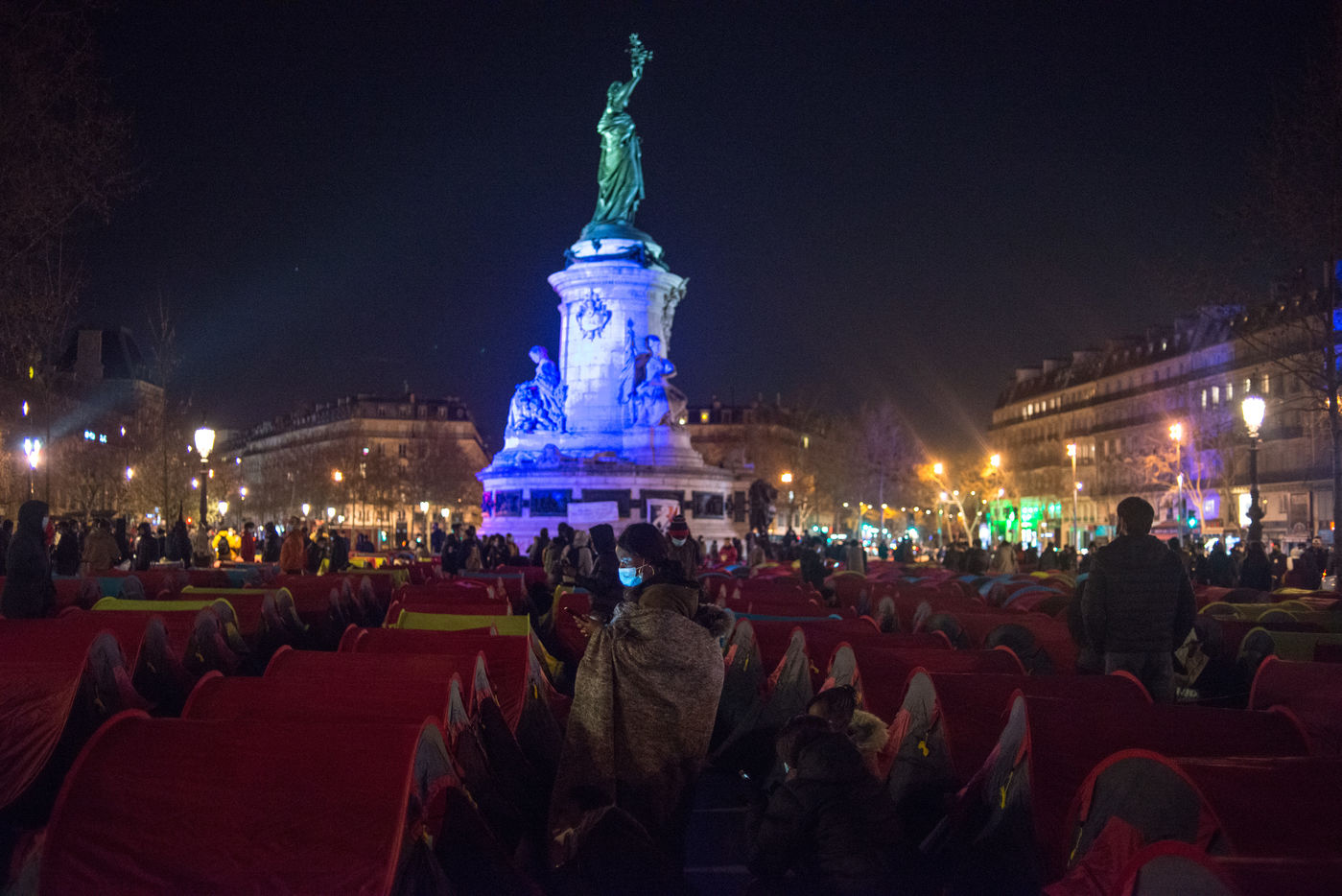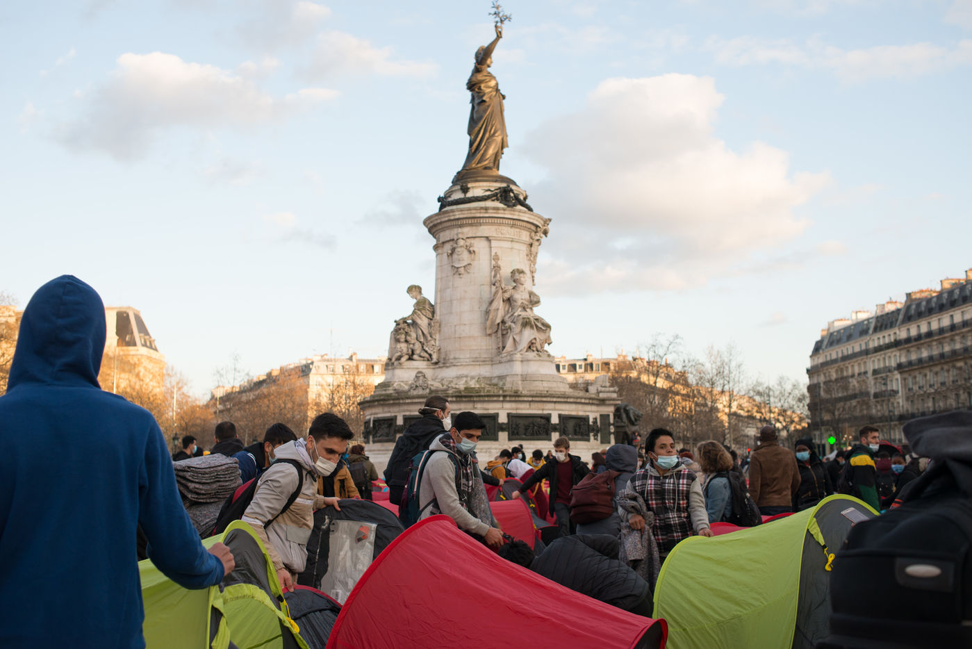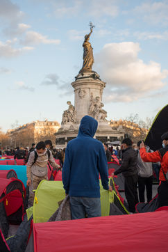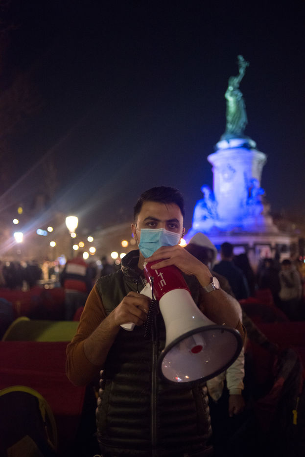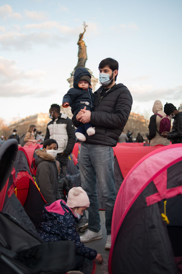 An exile camp settles in République for "the Night of Solidarity" at the initiative of several associations in order to "request immediate, stable and decent accommodation" for the exiles, on March 25, 2021 in Paris.
