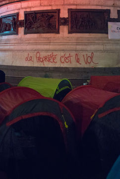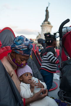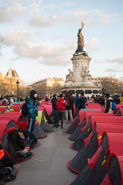 Un campement d'exilés s'installe à République pour "la Nuit de la Solidarté" à l?initiative de plusieurs associations afin de demander un hébergement immédiat, stable et décent pour les exilés, le 25 mars 2021 à Paris.