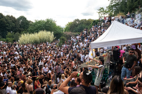 Festival Open Air géant avec DJ-set hits house, minimale et disco des collectifs parisiens Toilettes Mixtes & Cookies Records, à l'amphithéâtre du parc de Belleville, l'après-midi du 2 septembre 2023 à Paris.