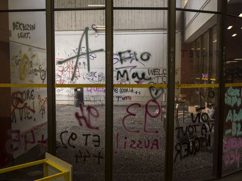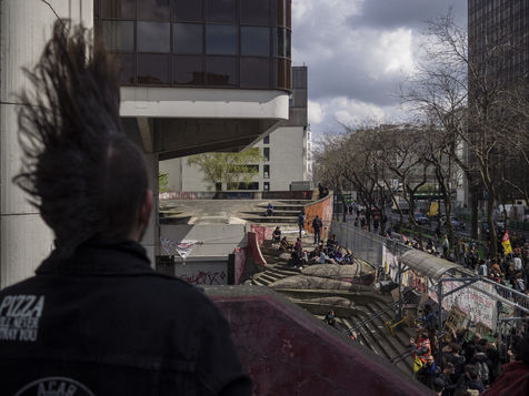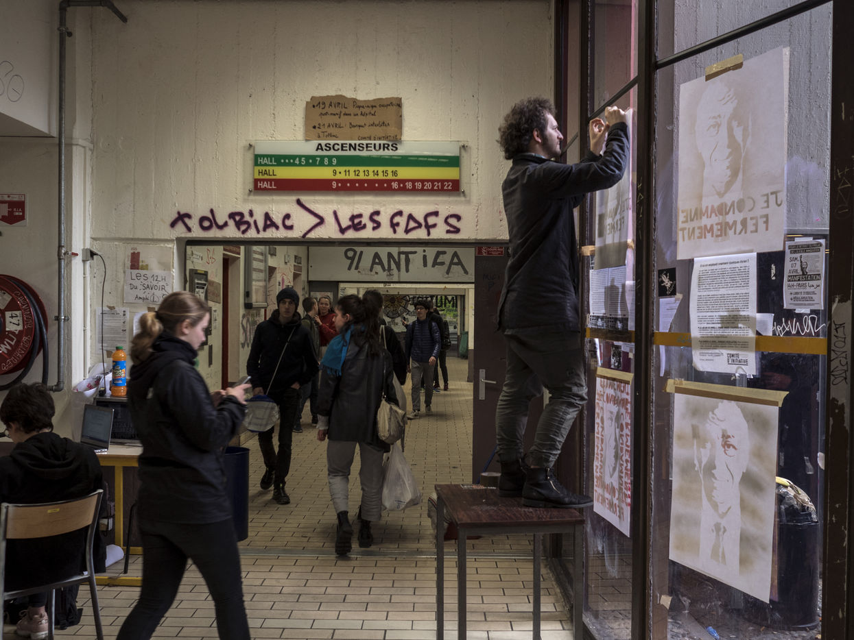 L'université Paris 1 Sorbonne Centre Mendes France, dans le XIIIe arrondissement de Paris - Surnommé la "Commune de Tolbiac" le site est occupé depuis le 26 mars par des étudiants et des militants, suite à une mobilisation contre les réformes du ministère de l'Education et du gouvernement Macron. Paris, France, le 13 avril 2018.