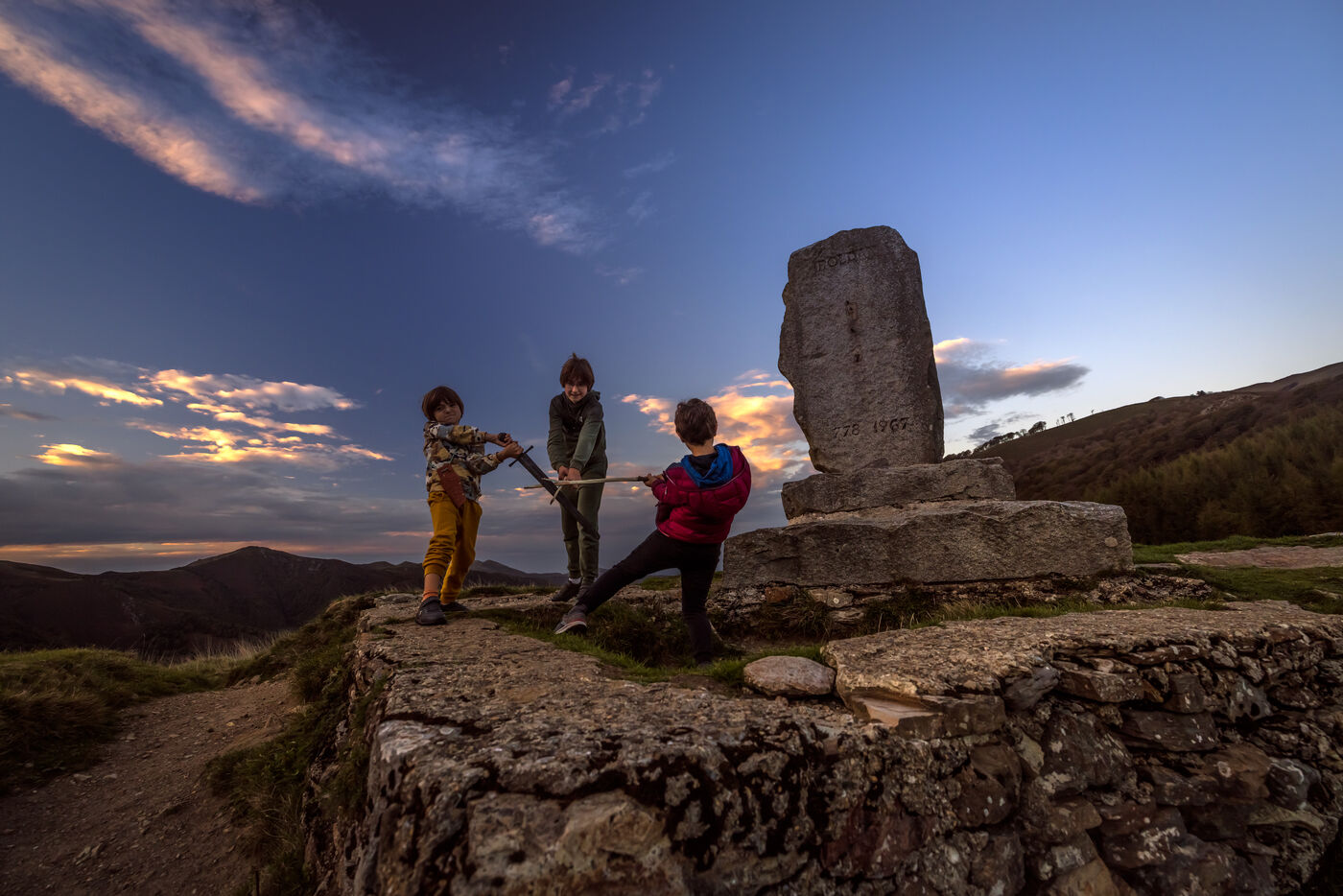 whatever the historic truth is, the myth is still alive, as shown by this photo of three Spanish children playing Roland battle at the foot of the monument on the Ibañeta pass lauding the knight Roldan.