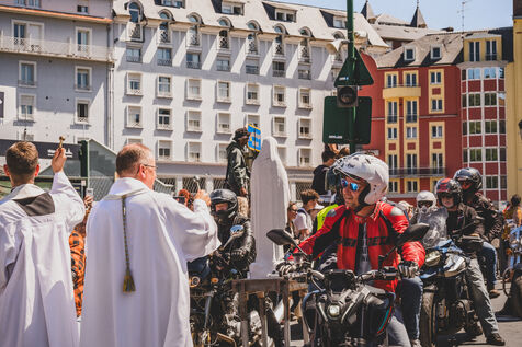 On June 15 and 16, 2024, at the foot of the Pyrenees, the town of Lourdes hosted the 32nd edition of the Pèlerinage des Motards. 4000 two-wheeled enthusiasts from all over France and Spain took part in this original spiritual and festive gathering. From acrobatic motorcycle shows to the express recustomization of vintage bikes, a ride over the misty passes of the Pyrenees and, of course, the moment so eagerly awaited by pilgrims, the blessing of thousands of bikers in leather jackets in front of Saint Michel Gate in the presence of the statue of a Virgin of the Bikers, the event could not leave onlookers indifferent. It success owes much to the commitment of Stéphane Peyras, the Pilgrimage's founding president, and the support of Thierry Lavit, the Mayor of Lourdes, himself a motorcyclist.