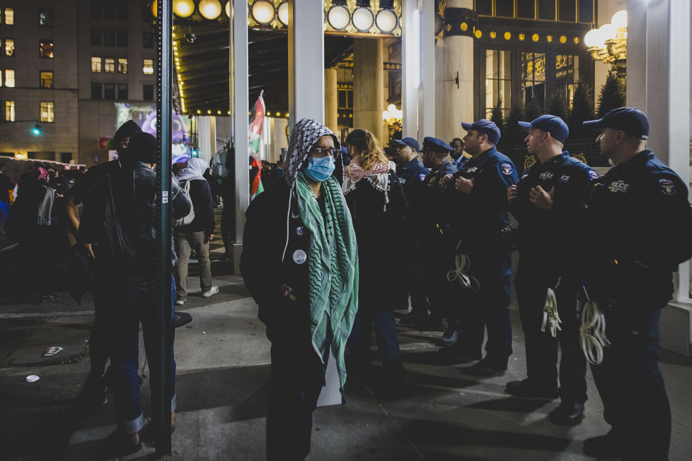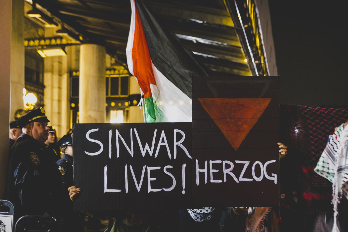 Un petit groupe de manifestants pro palestiniens a protesté contre la venue du Président d'Israël Isaac Herzog à l'hôtel Plaza à New York.