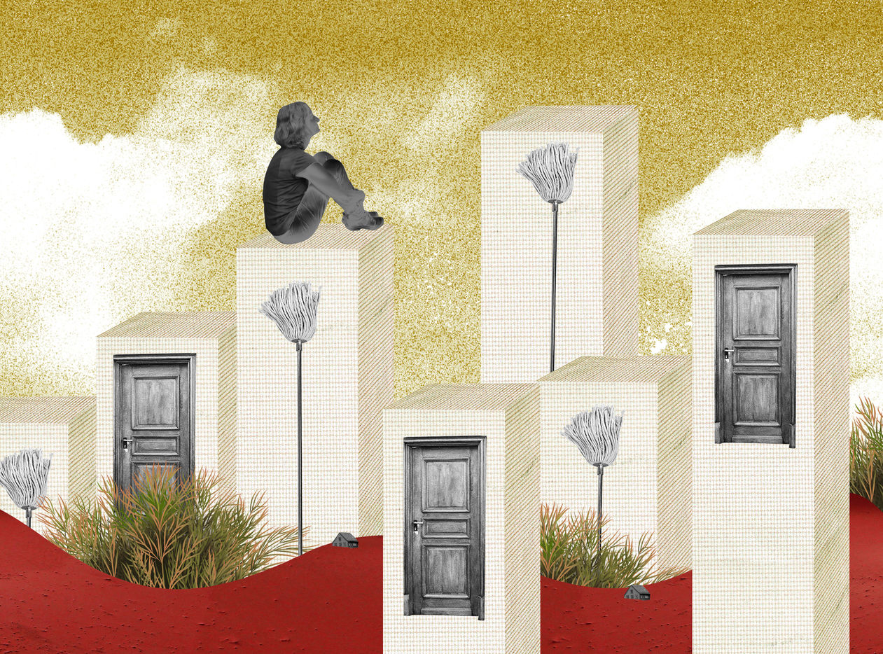 Série de collages et photomontages pour illustrer les conditions de santé dans le monde du travail et les parcours de reconversion et formation.