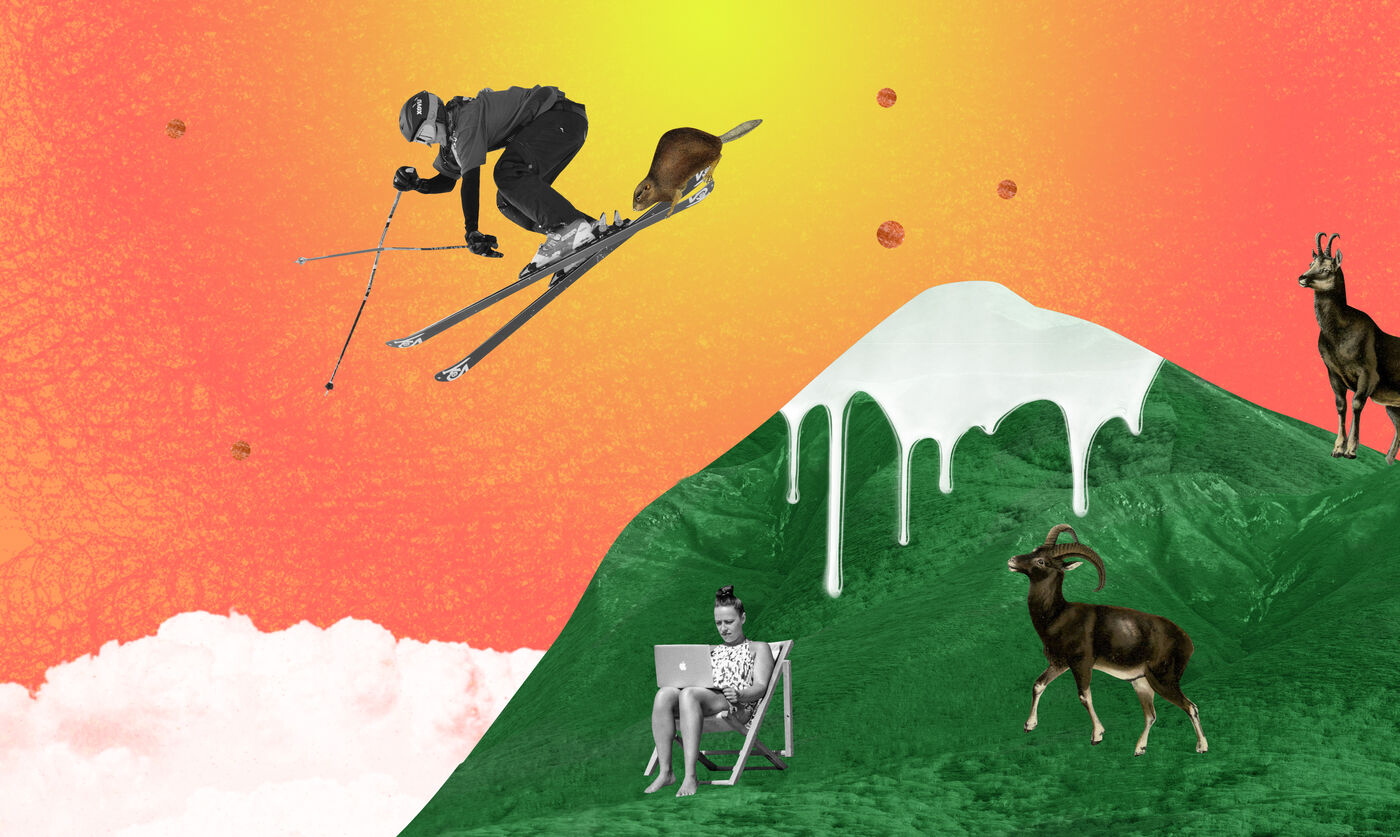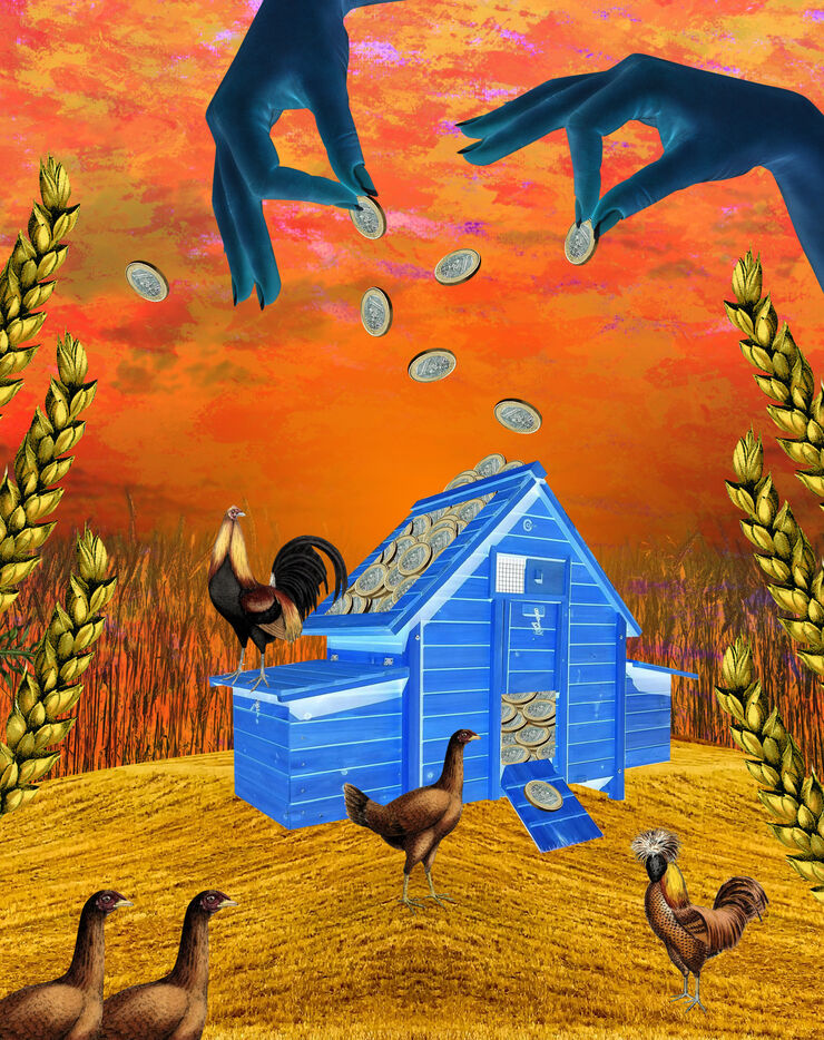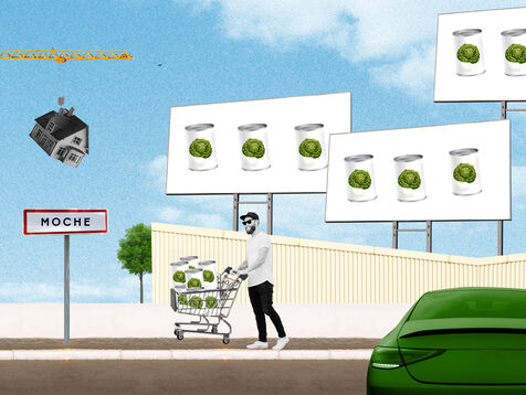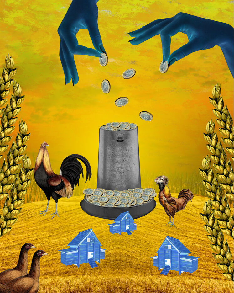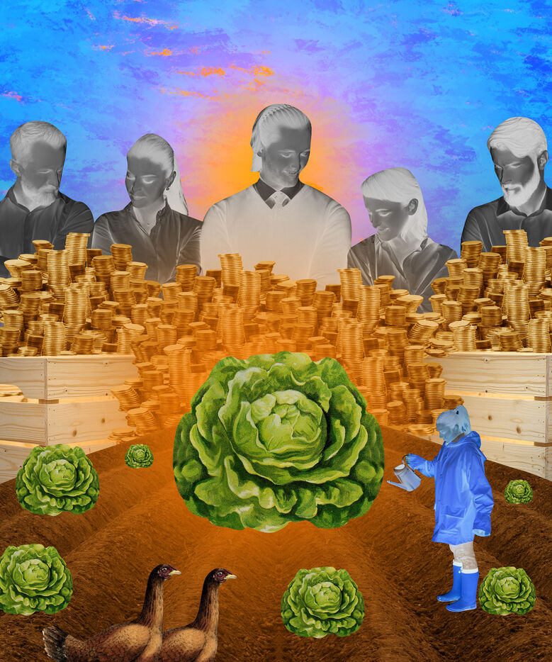 A series of collages and photomontages based on ecological themes: citizens buying up forests to protect them, melting ice, the disappearance of town centers in villages in favor of “ugly” city entrances, private investments in market-garden farms .