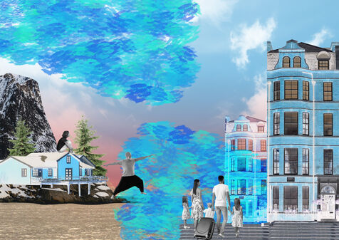 A series of collages on the theme of tourists swapping homes for vacations around the world.