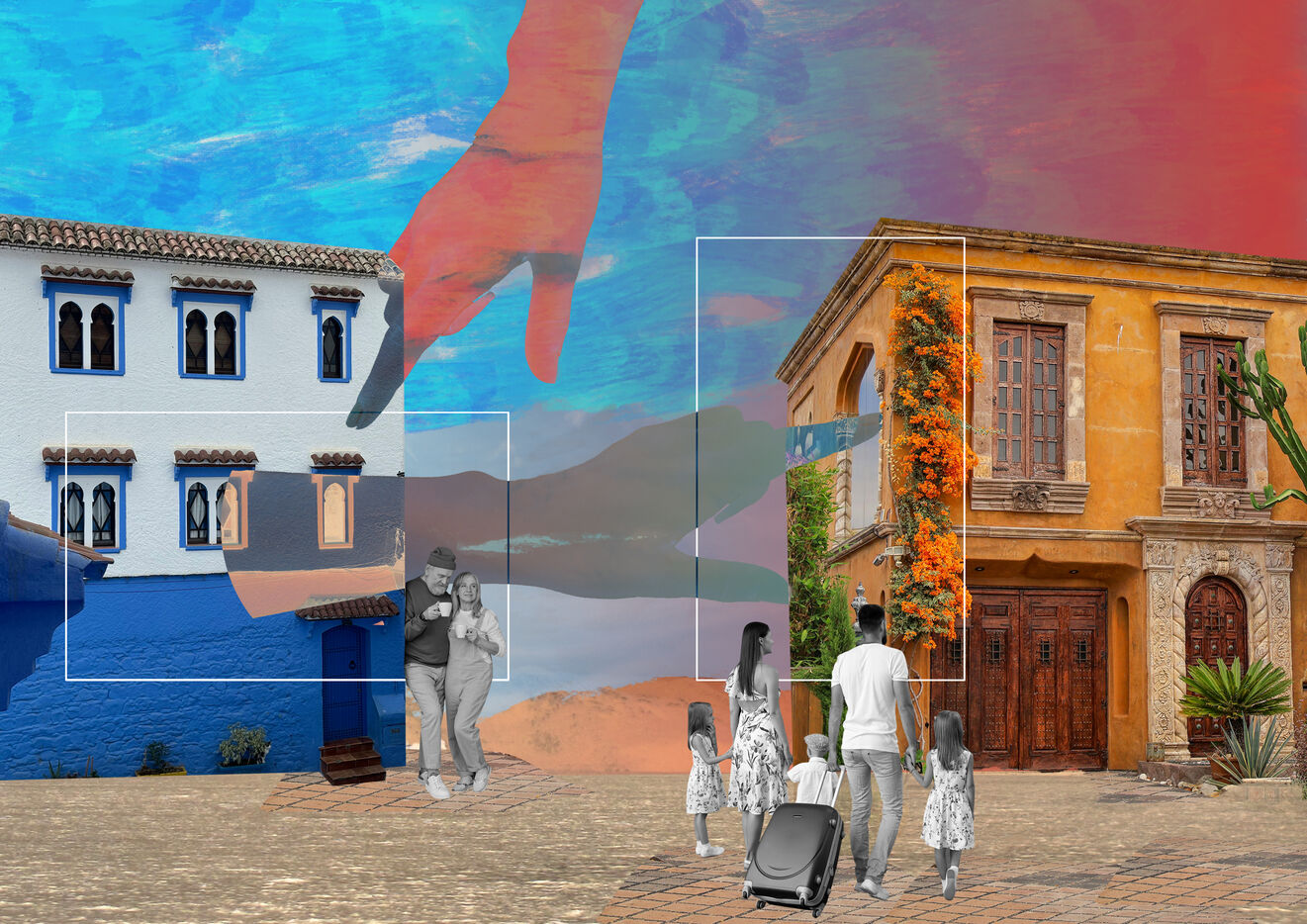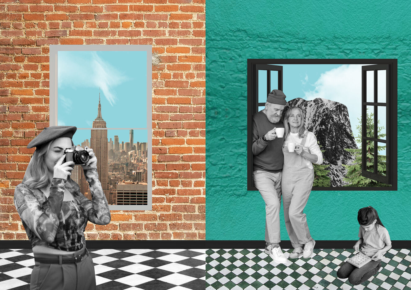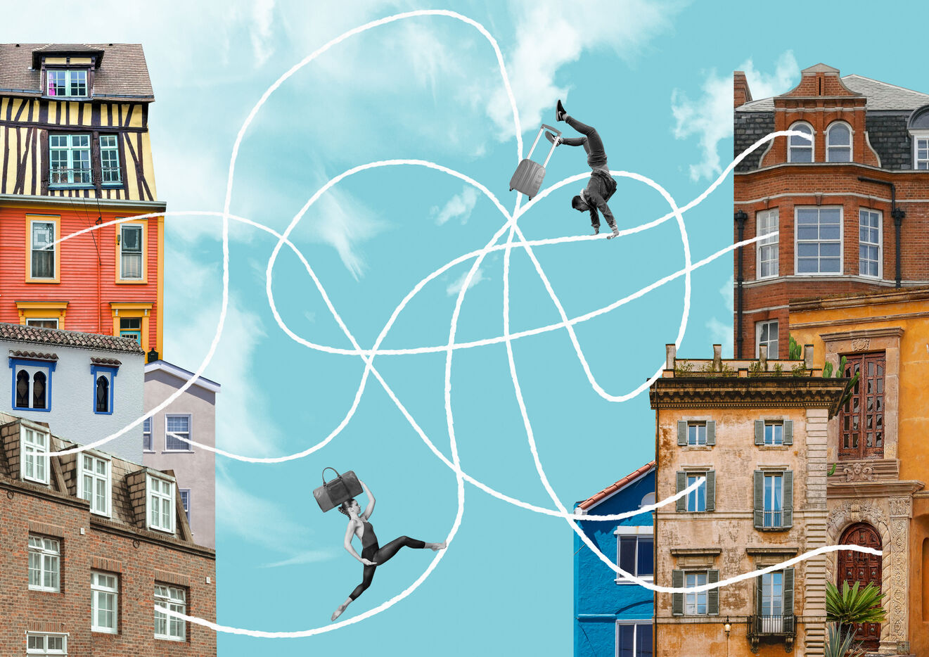 Série de collages sur le thématique des touristes qui échangent leurs maisons pour les vacances à travers le monde