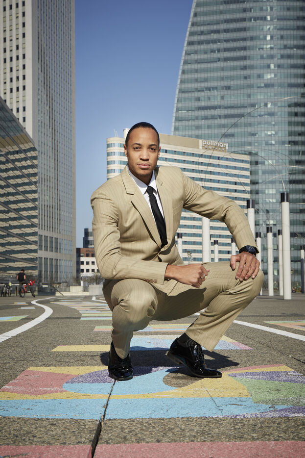 Pascal Martinot Lagarde, athlète français, spécialiste du 110 mètres haies et détenteur du record de France du 110 mètres haies en 12 s 95, pose pour une série de portrait dans le quartier de la Défense.