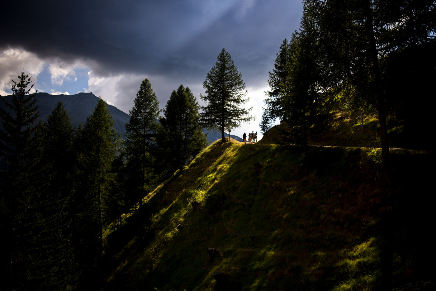 Une atmosphère de lumières particulaires, de bois ajourés, dans les hauteurs préservées, au fil d'un chemin de croix gorgé de soleil. En fin de journée, particulièrement, l'étirement des ombres des croix sur les sentiers confère à la marche une aura spirituelle. Marcher. Respirer. Se croiser en se souhaitant une « bonne journée » qui résonne. Ici, les bâtons de pèlerins se confondent avec les bâtons de marche nordique. Et c'est en famille, toutes générations confondues, que l'on gagne assez simplement, en short et solides chaussures de marche, la chapelle du XVIIIe siècle, le sanctuaire marial, les eaux bienfaisantes...