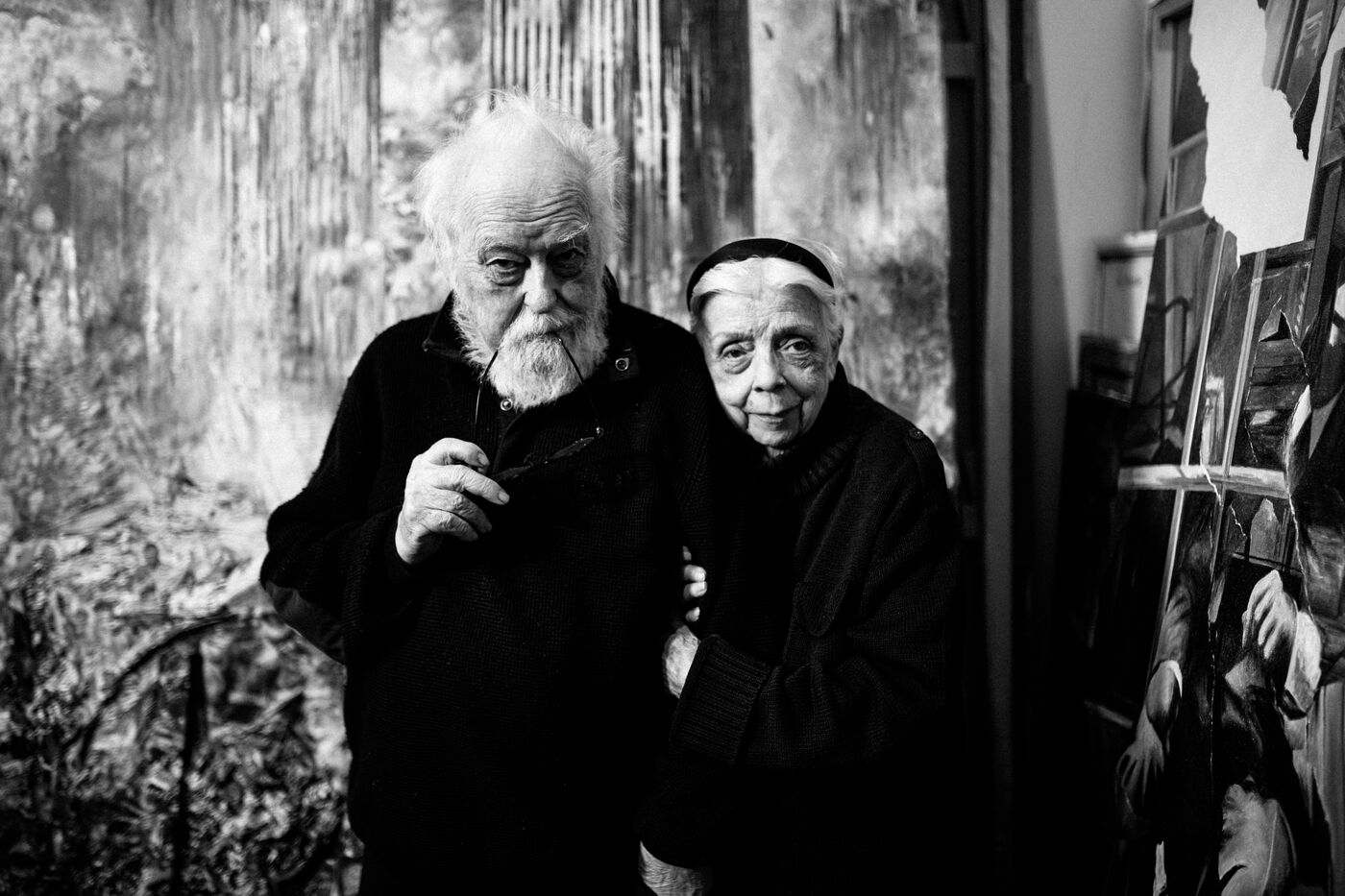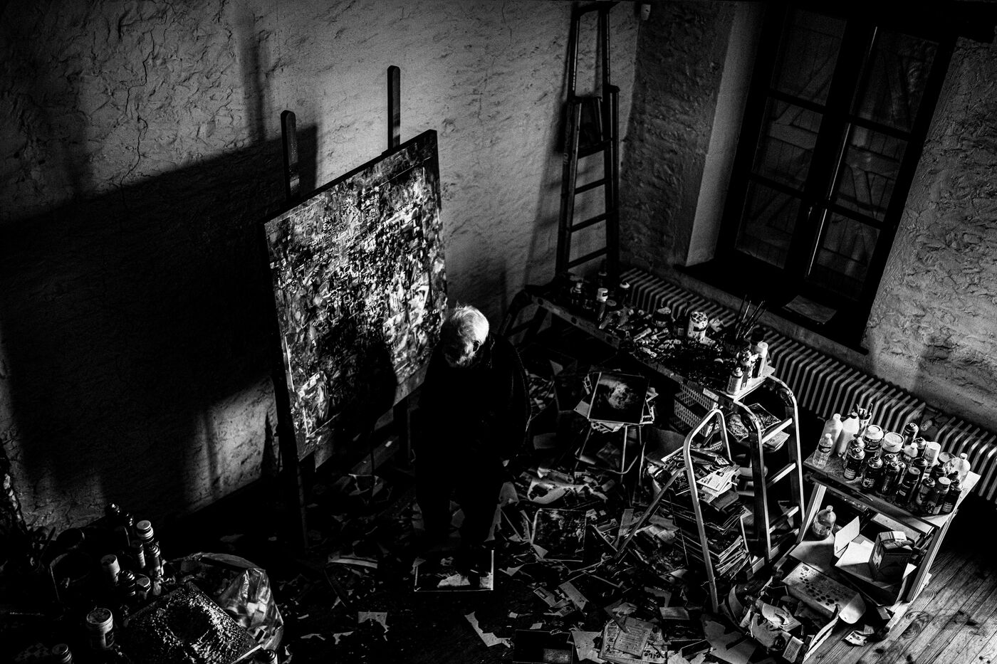 This photo essay, alternating between color (for the present) and black and white (for the past and the timeless), offers an intimate immersion into his universe: portraits, studio details, fragments of artworks, collages, and archives. He no longer wished to recount everything — the war, his father, the sixties, or the fight led by his wife, still his “very dedicated press officer,” against the death penalty. The concerts with Georgie Viennet, Ferré, Ferrat... All of it belonged to their shared past.