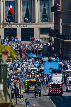 Montée HAC Ligue 1 : Parade dans la rue de Paris en bus impérial, après leur victoire finale sur Dijon en ligue 2 BKT, le HAC est champion de Ligue 2 BKT et monte en ligue 1 la saison prochaine.