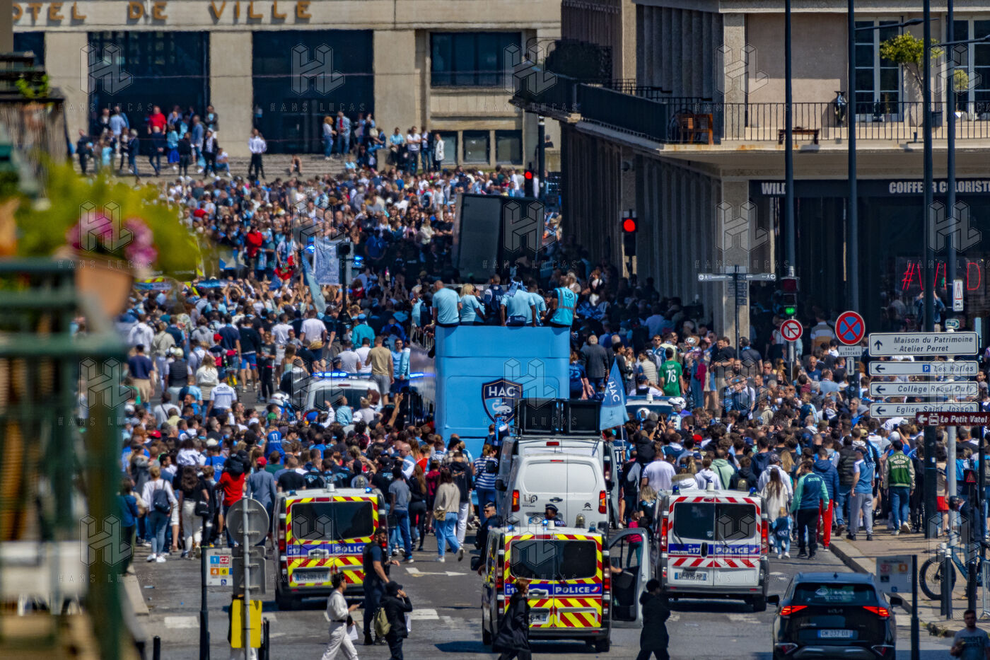 HAC Ligue 1 climb: Parade in the rue de Paris by imperial bus, after their final victory over Dijon in league 2 BKT, the HAC is champion of Ligue 2 BKT and goes up to league 1 next season.