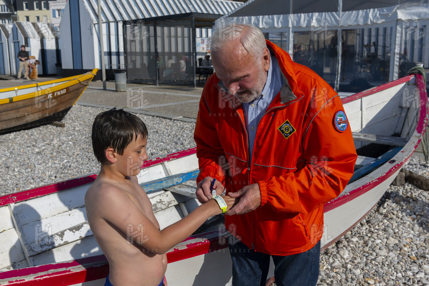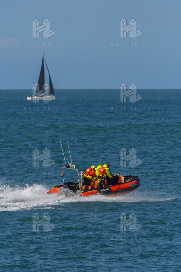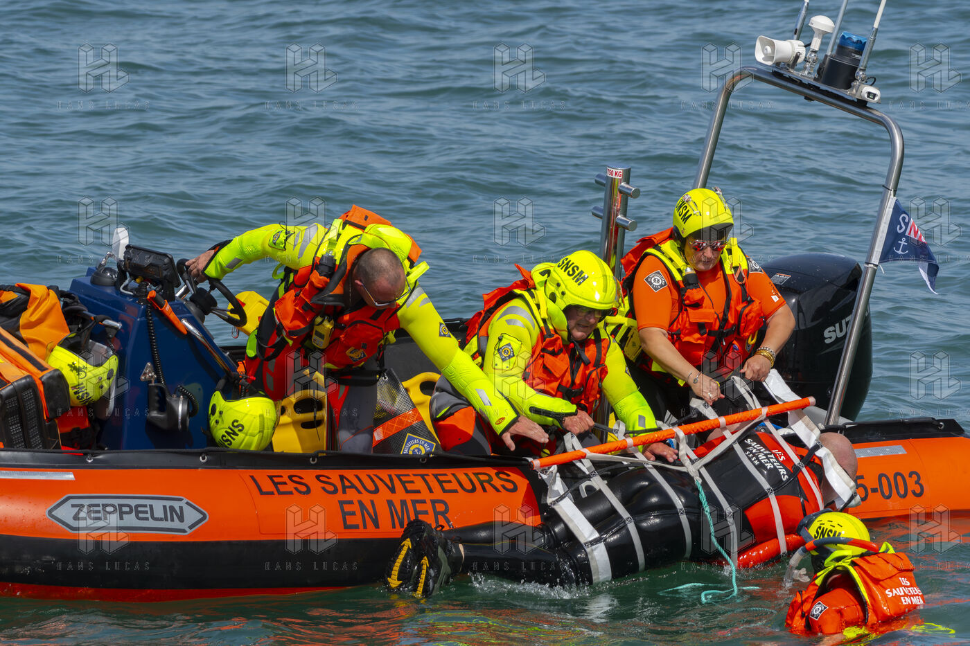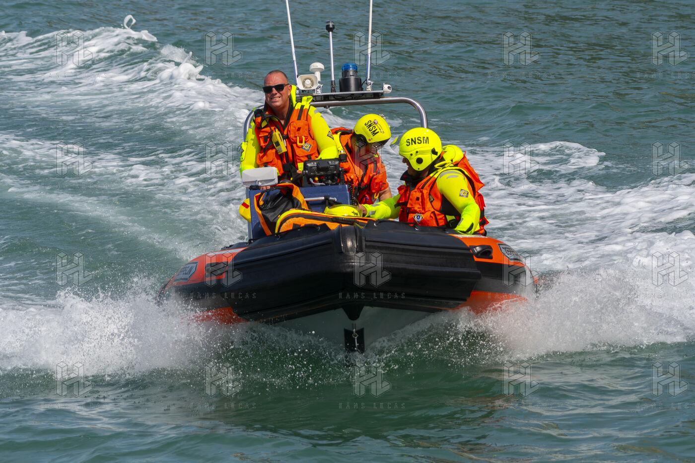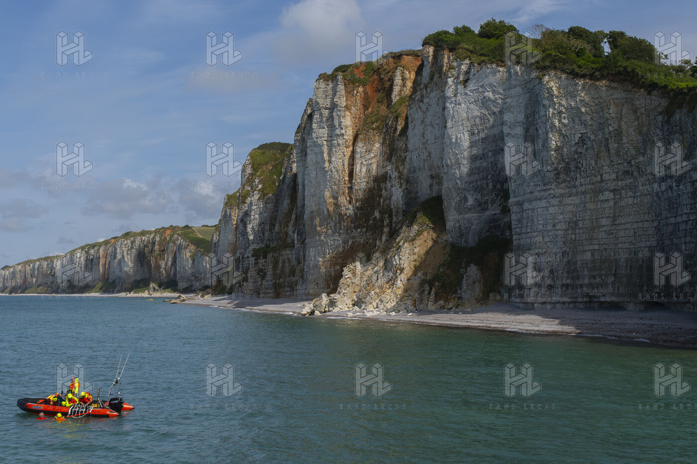 La SNSM d'Yport en Seine Maritime, effectue des exercices de sauvetages devant la baie d'Yport, une belle journée enseoleillée de Juillet, les éoliennes offshore de Fecamp sont en fond, des bateaux, voiliers, la falaise montre l'érosion du au climat, un petit garçon demande un bracelet au responsable de la station de la SNSM d'Yport monsieur Jean Luc Lars.