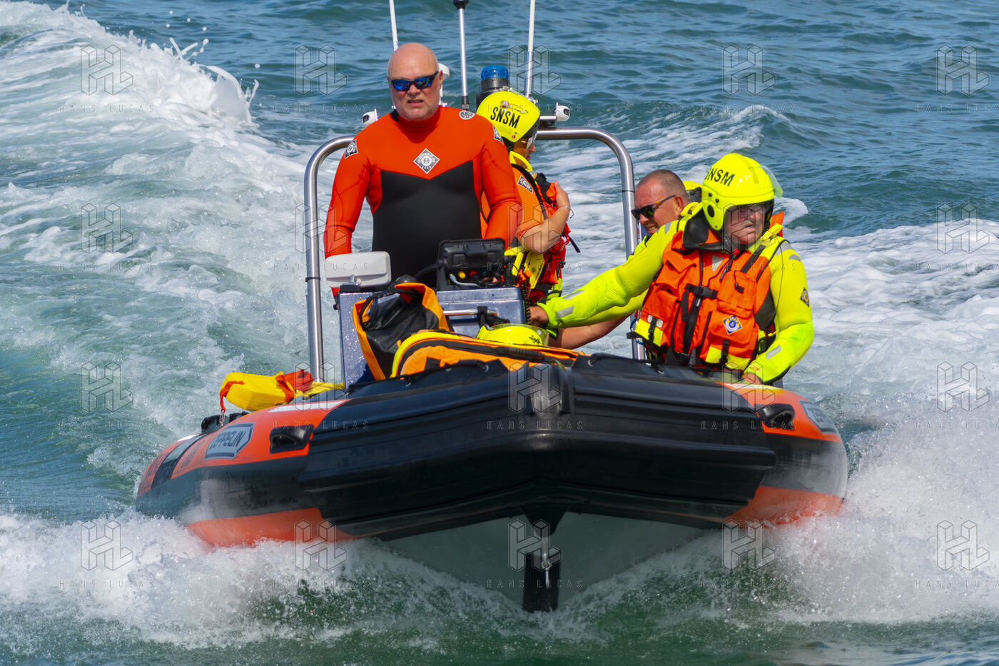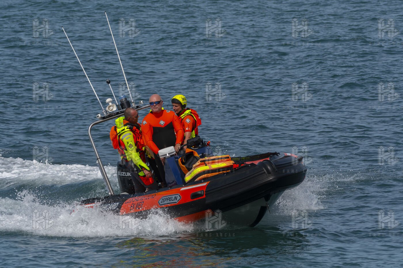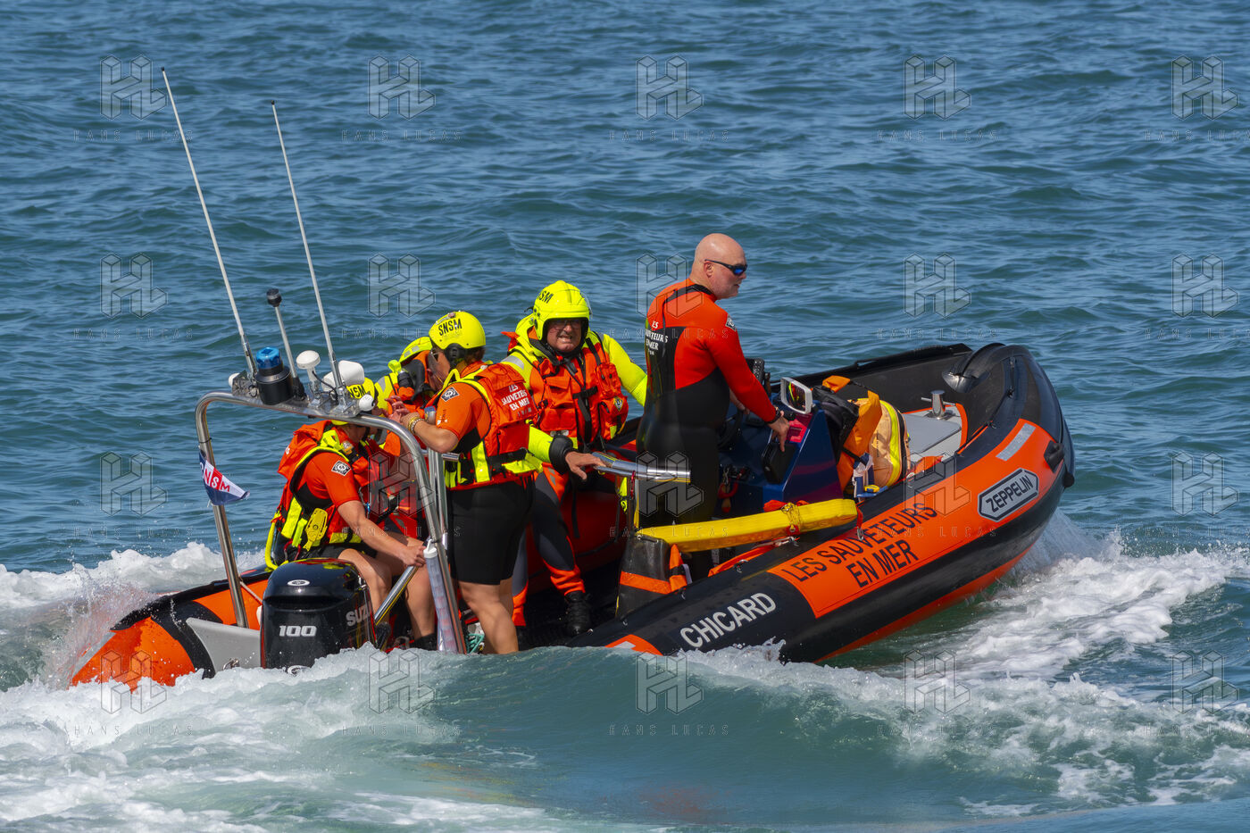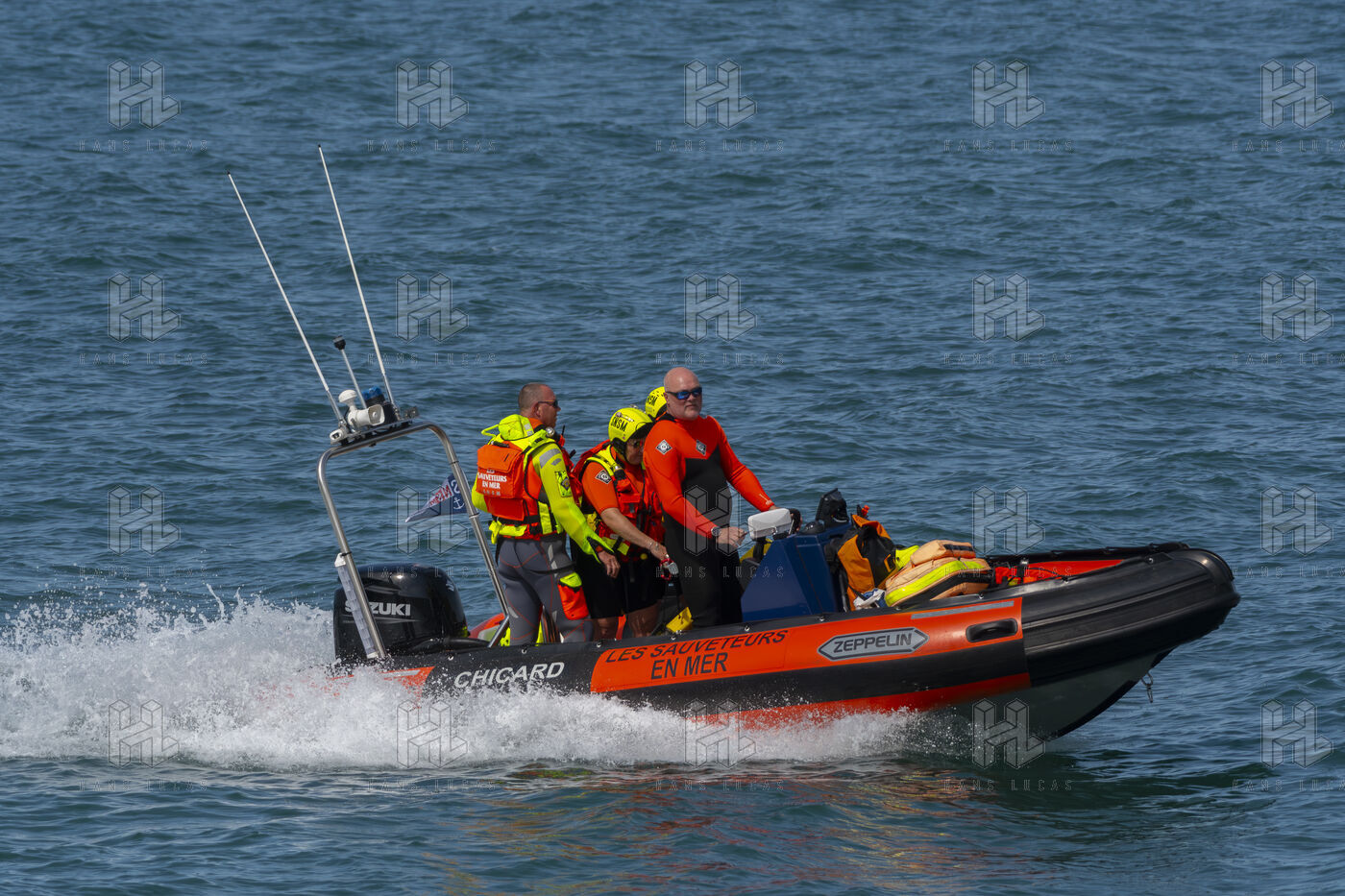 La SNSM d'Yport en Seine Maritime, effectue des exercices de sauvetages devant la baie d'Yport, une belle journée enseoleillée de Juillet, les éoliennes offshore de Fecamp sont en fond, des bateaux, voiliers, la falaise montre l'érosion du au climat, un petit garçon demande un bracelet au responsable de la station de la SNSM d'Yport monsieur Jean Luc Lars.