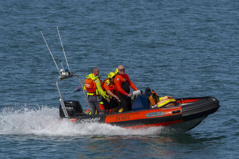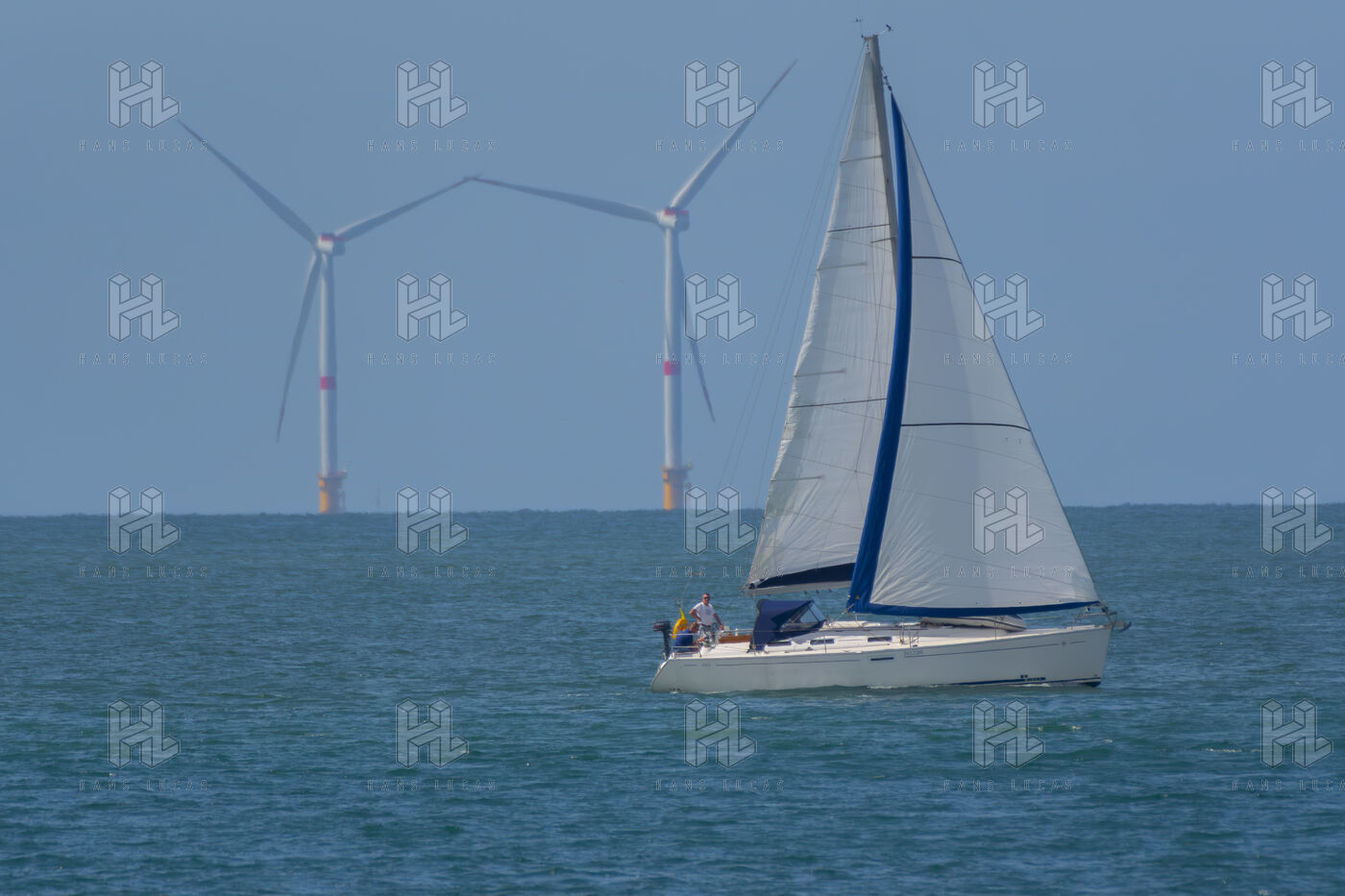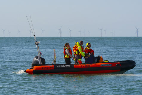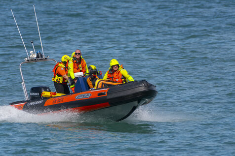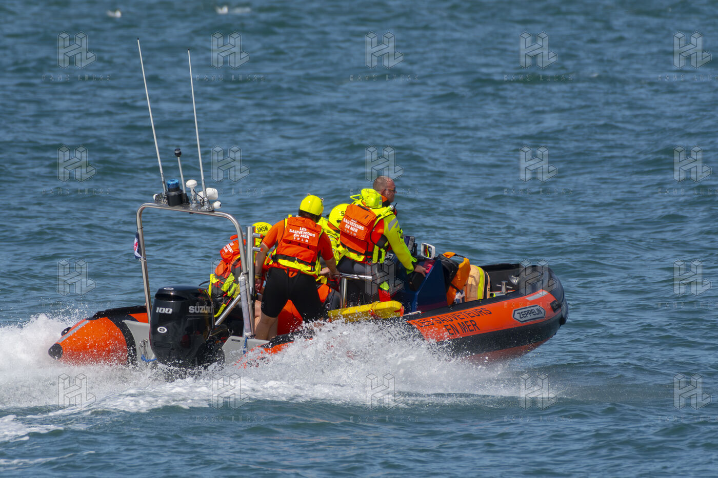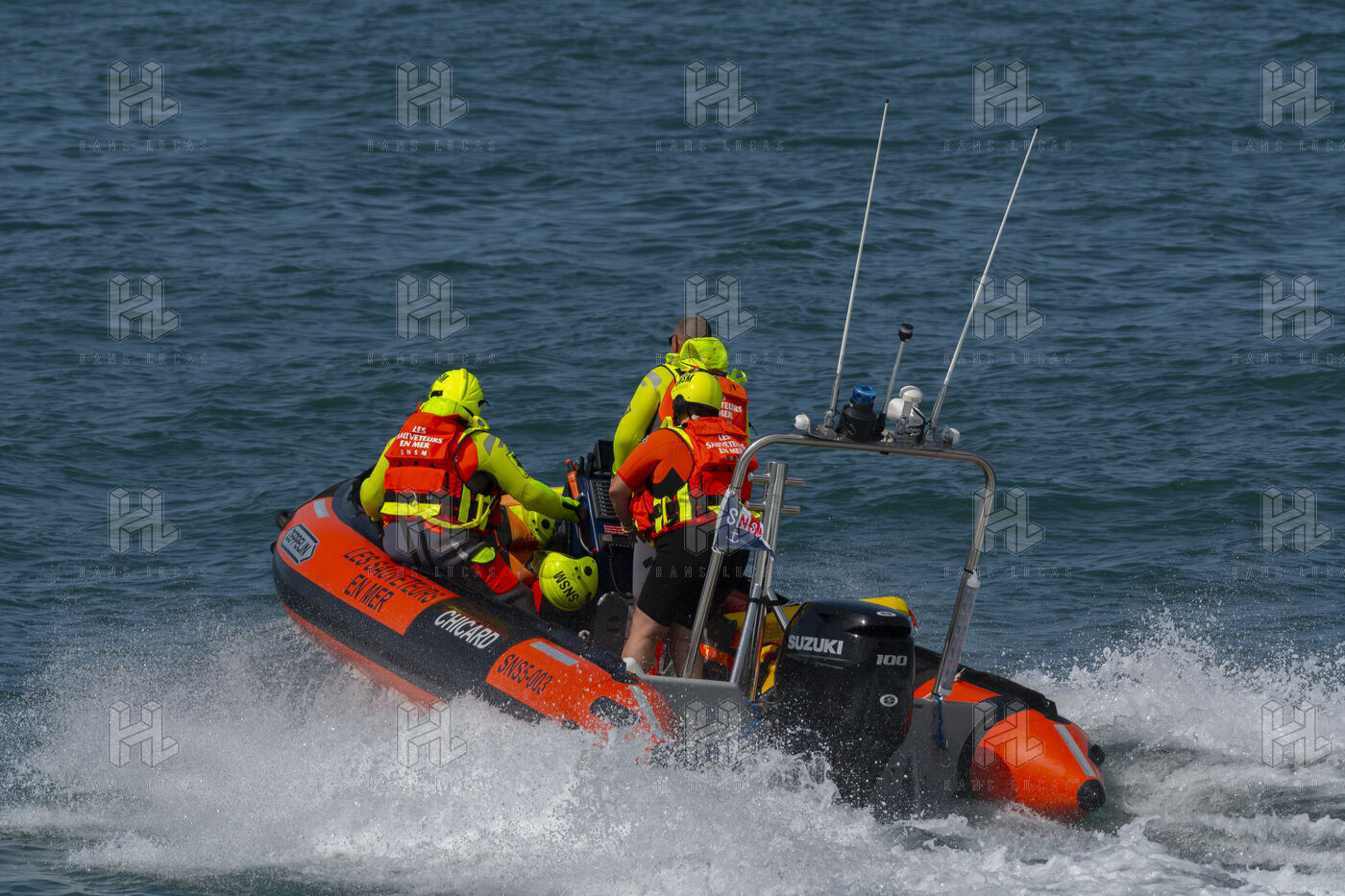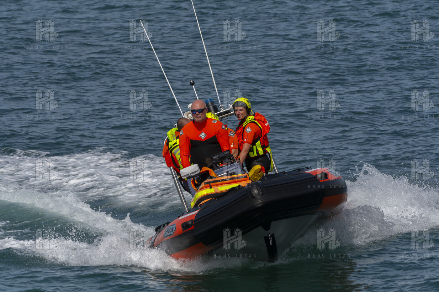 La SNSM d'Yport en Seine Maritime, effectue des exercices de sauvetages devant la baie d'Yport, une belle journée enseoleillée de Juillet, les éoliennes offshore de Fecamp sont en fond, des bateaux, voiliers, la falaise montre l'érosion du au climat, un petit garçon demande un bracelet au responsable de la station de la SNSM d'Yport monsieur Jean Luc Lars.