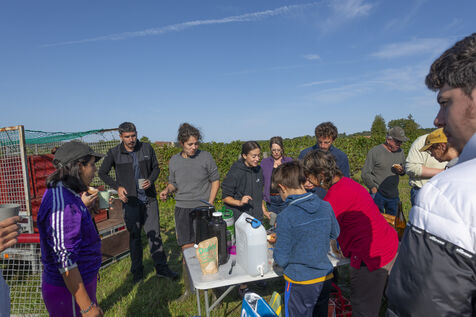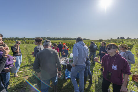 Vendanges du raisin blanc chenin, dans les vignes de Sandrine et Christophe Deschamps vignerons bio, la récolte du précieux raisin blanc Chenin s'effectue avec de nombreux saisonniers, des vendangeurs qui parcourent chaque rang de vignes à la recherche des grappes de raisin blanc, qui donneront ce délicieux nectar qu'est le chenin. Beaucoup de travail et de bonne humeur, de la musique qui retentit des enceintes portatives, de l'entrain et beaucoup de sueur et de mal de dos. Heureusement ensuite le temps du partage autour de collations et petits repas viennent ponctuer la journée.