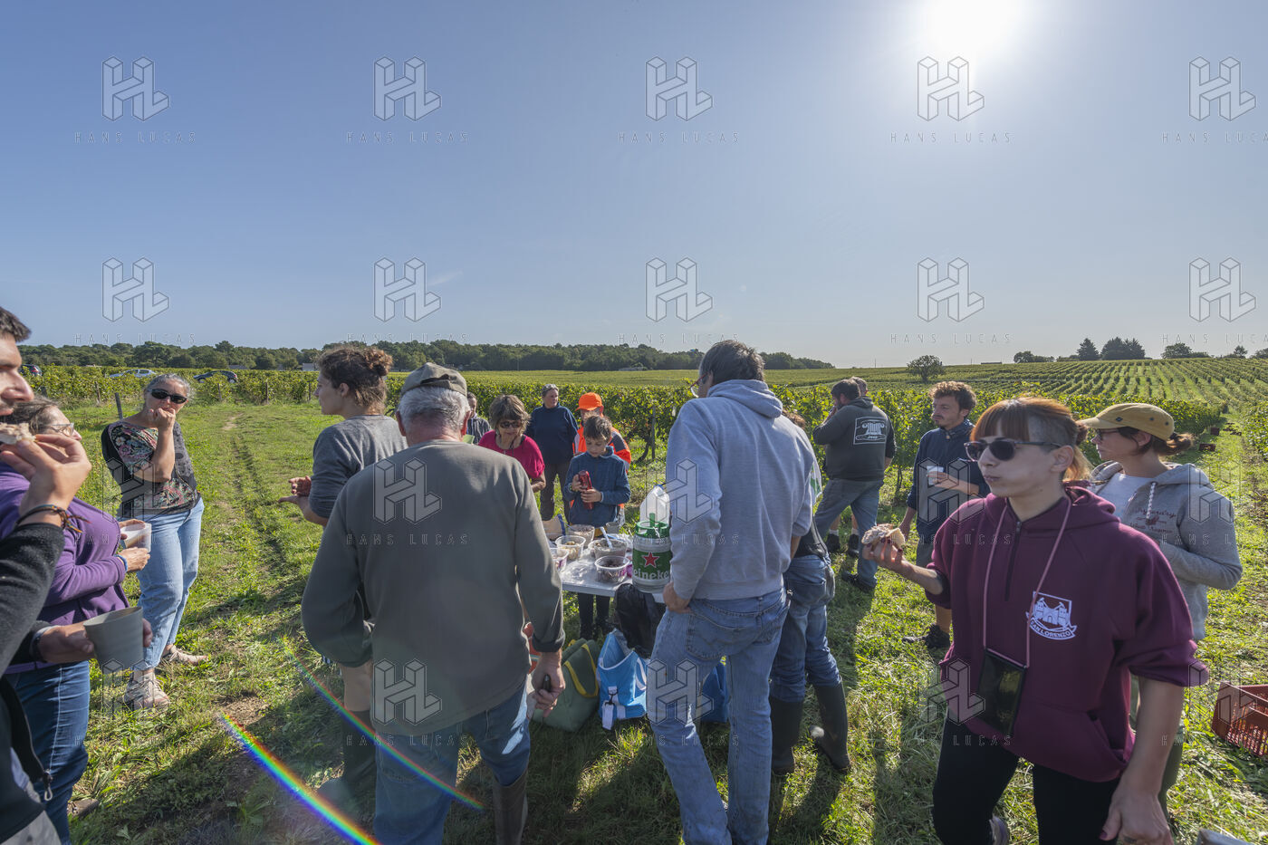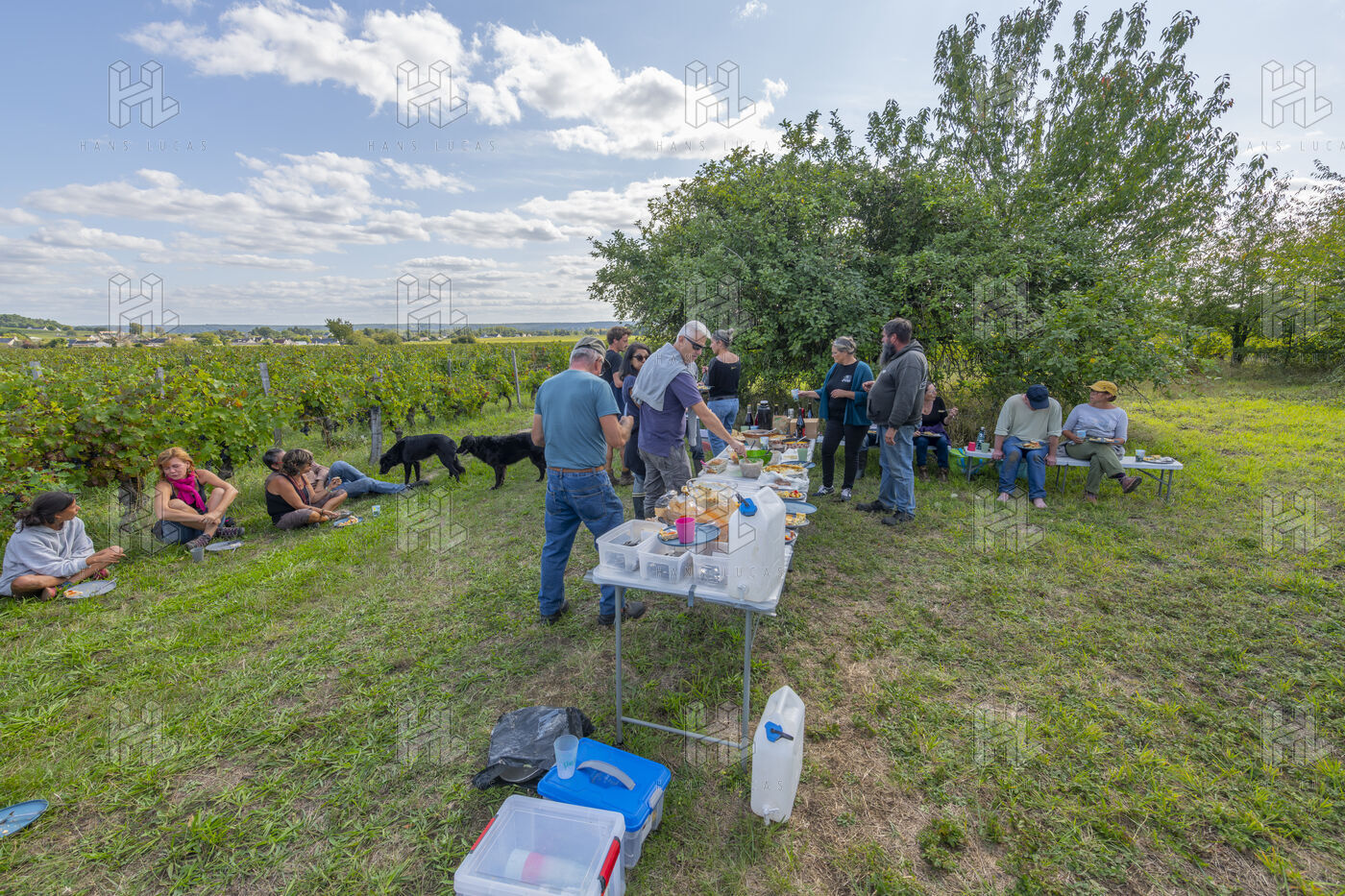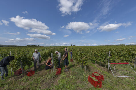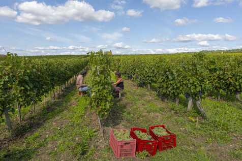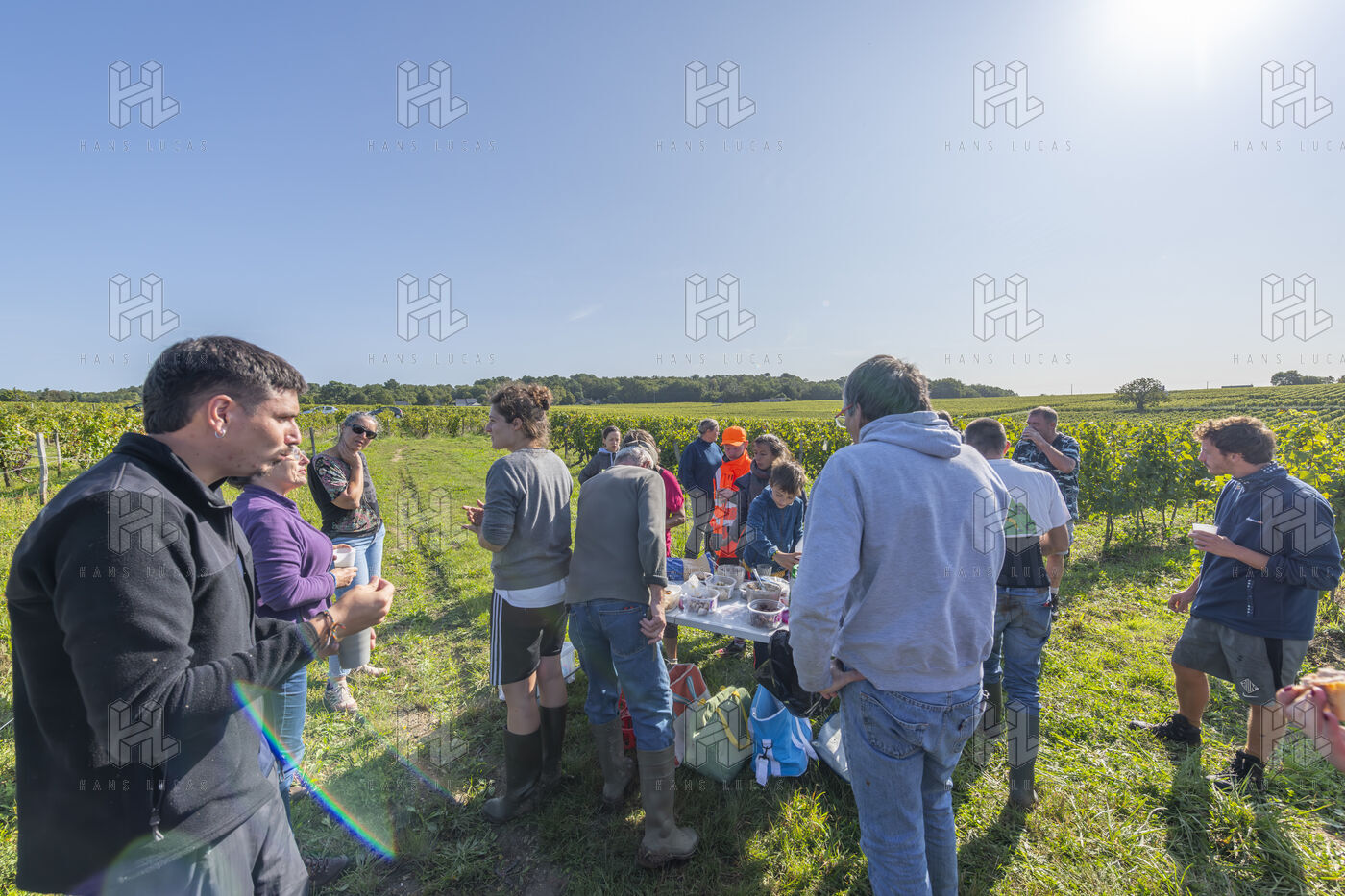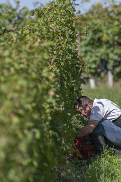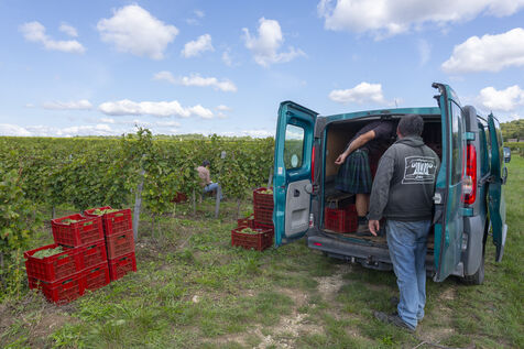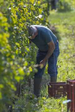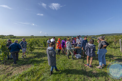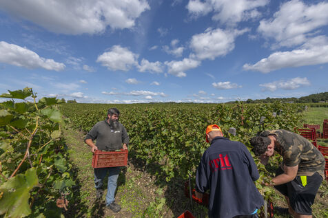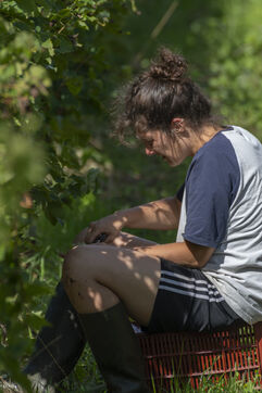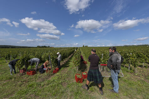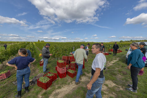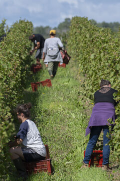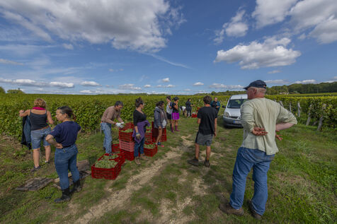 Harvesting of the white Chenin grape, in the vineyards of Sandrine and Christophe Deschamps organic producer, the harvest of the precious white Chenin grape is carried out with many seasonal workers, harvesters who go through each row of vines in search of the bunches of white grapes, which will give this delicious nectar that is Chenin. A lot of work and good humor, music that resounds from portable speakers, enthusiasm and a lot of sweat and back pain. Fortunately then the time for sharing around snacks and small meals punctuates the day.