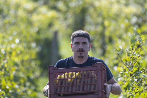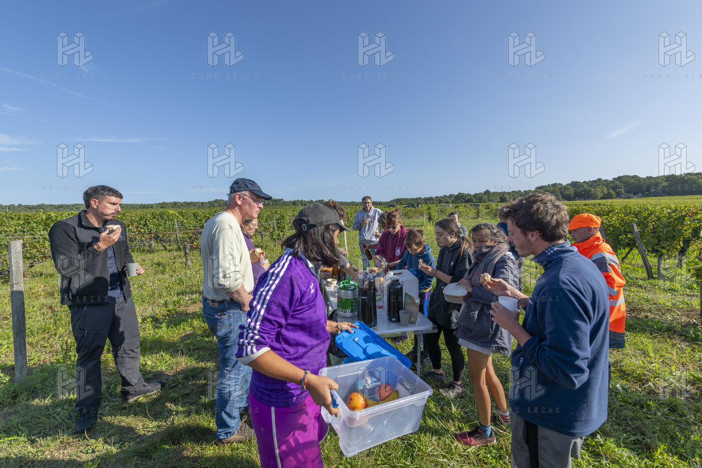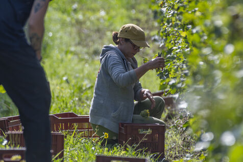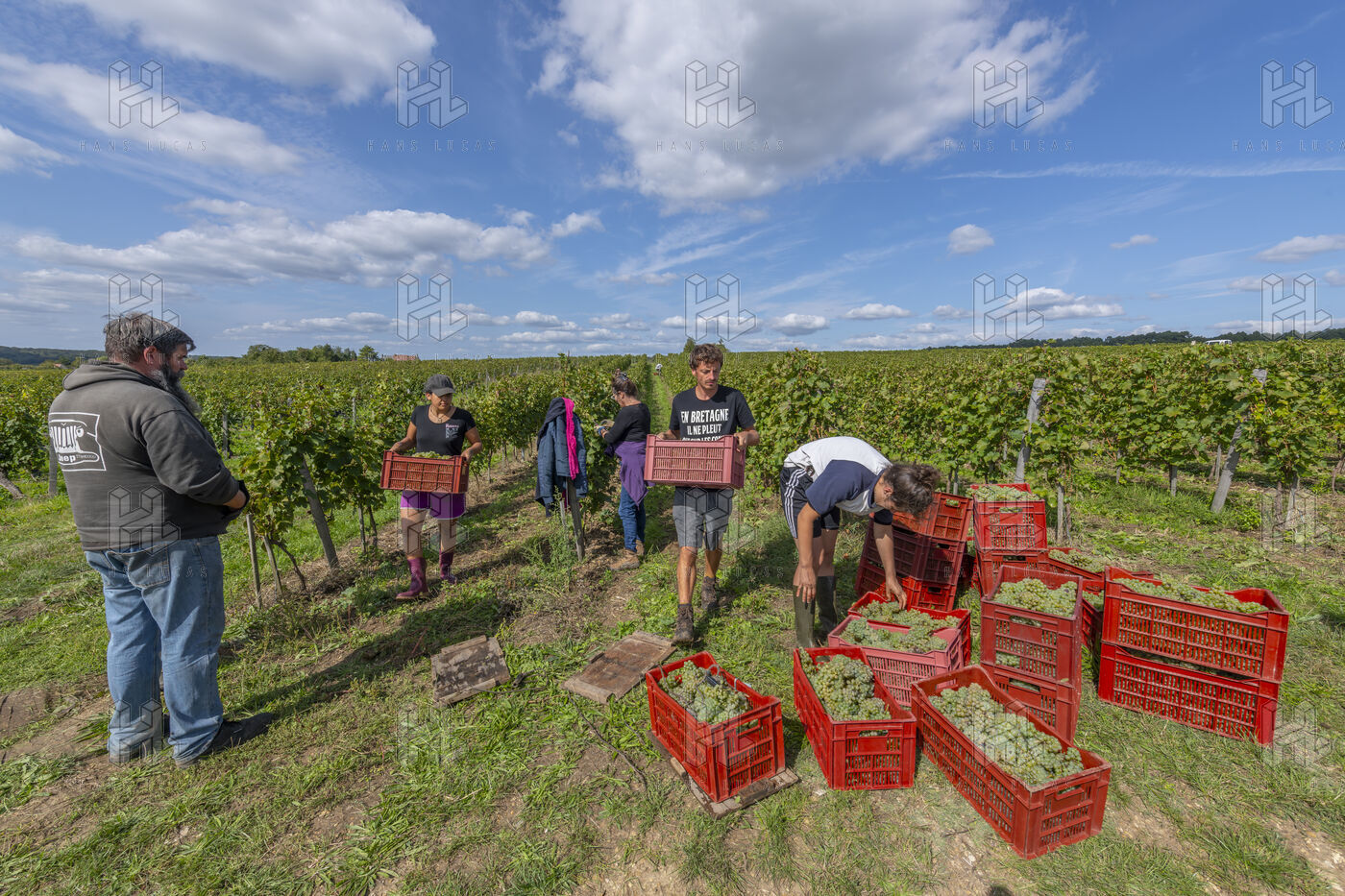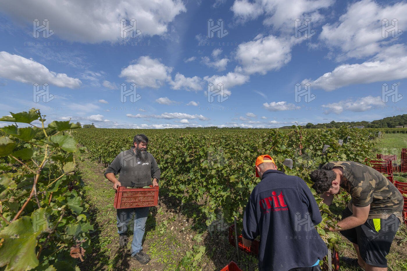 Harvesting of the white Chenin grape, in the vineyards of Sandrine and Christophe Deschamps organic producer, the harvest of the precious white Chenin grape is carried out with many seasonal workers, harvesters who go through each row of vines in search of the bunches of white grapes, which will give this delicious nectar that is Chenin. A lot of work and good humor, music that resounds from portable speakers, enthusiasm and a lot of sweat and back pain. Fortunately then the time for sharing around snacks and small meals punctuates the day.