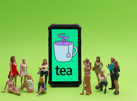 Tea est une appli qui vise à «aider les femmes à faire des rencontres en toute sécurité» en leur permettant de partager des informations sur l’homme avec qui elles sortent ou envisagent de sortir. Tout cela anonymement.Une notation avec des drapeau rouge ou vert sont appliqué pour savoir si les hommes sont recommandables. Ici ce sont de petits personnages mis en situation à coté d'un téléphone avec le logo de l'appli, des femmes et des hommes.