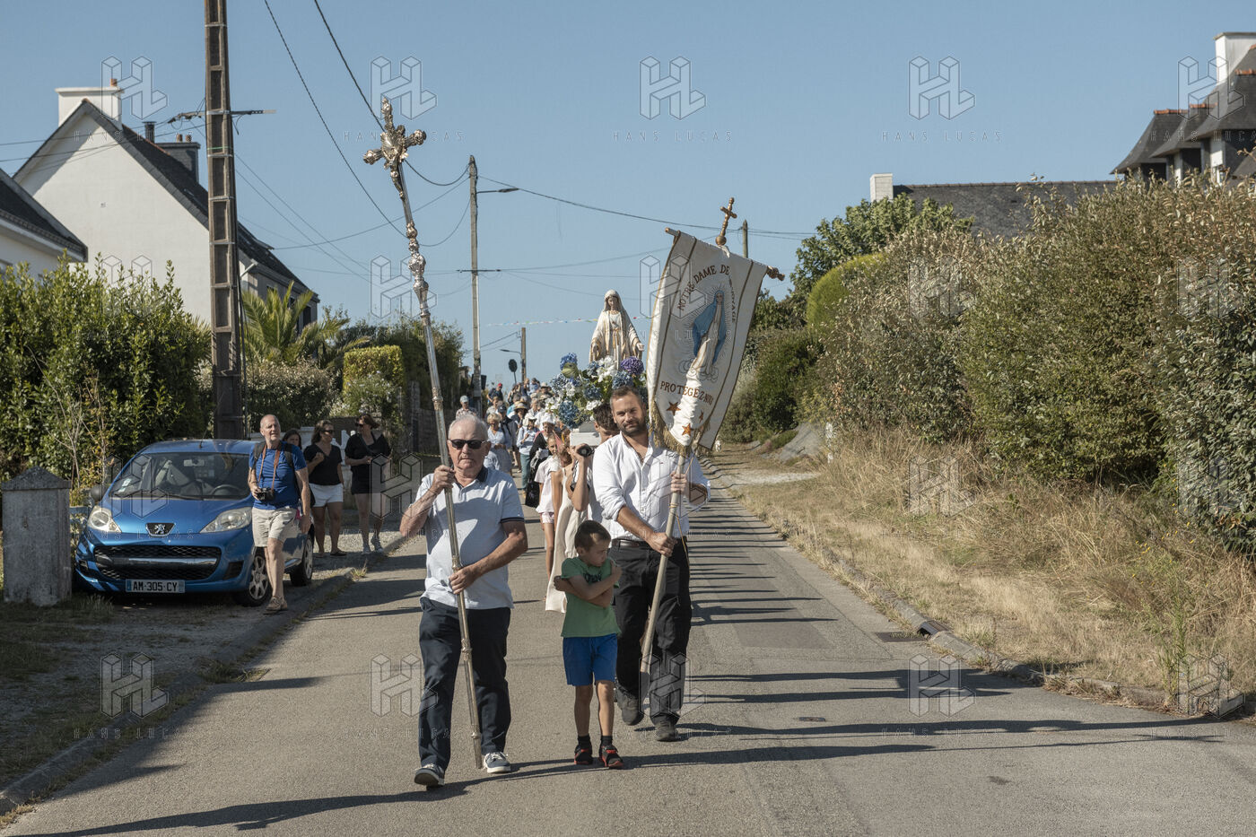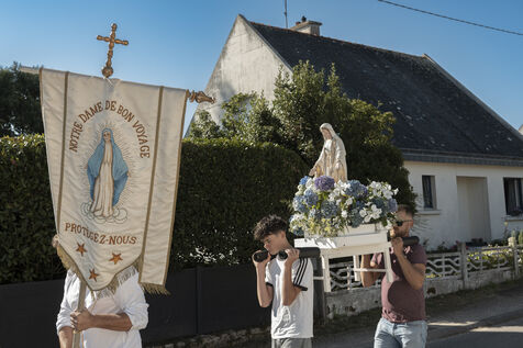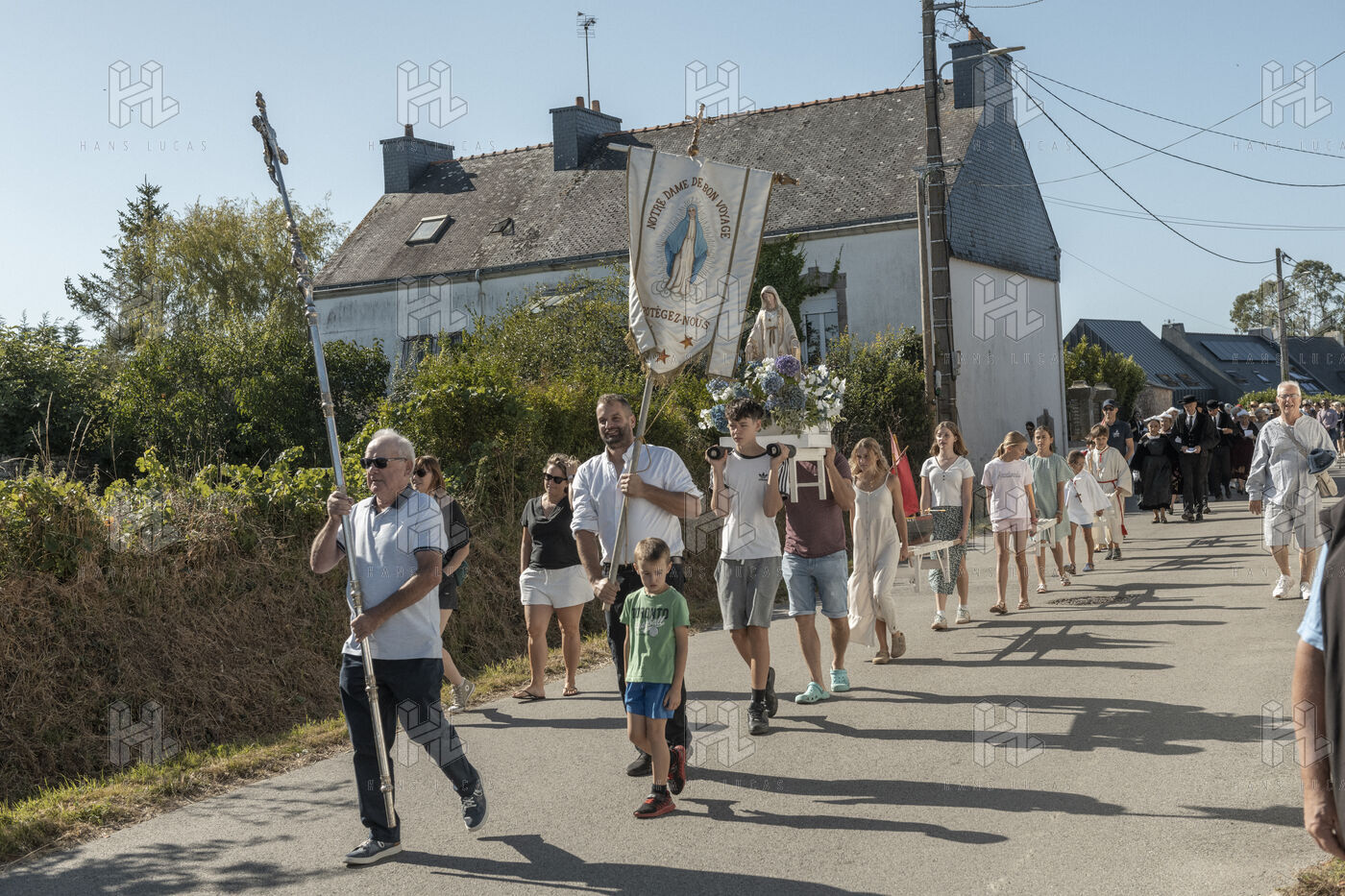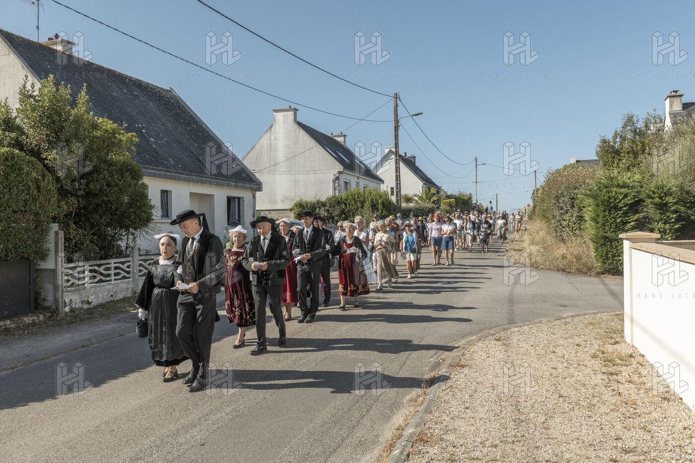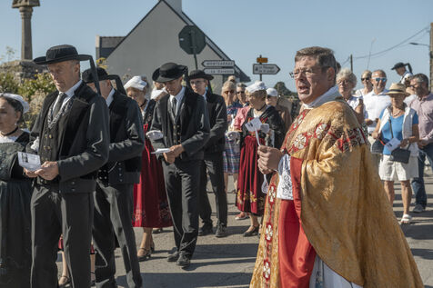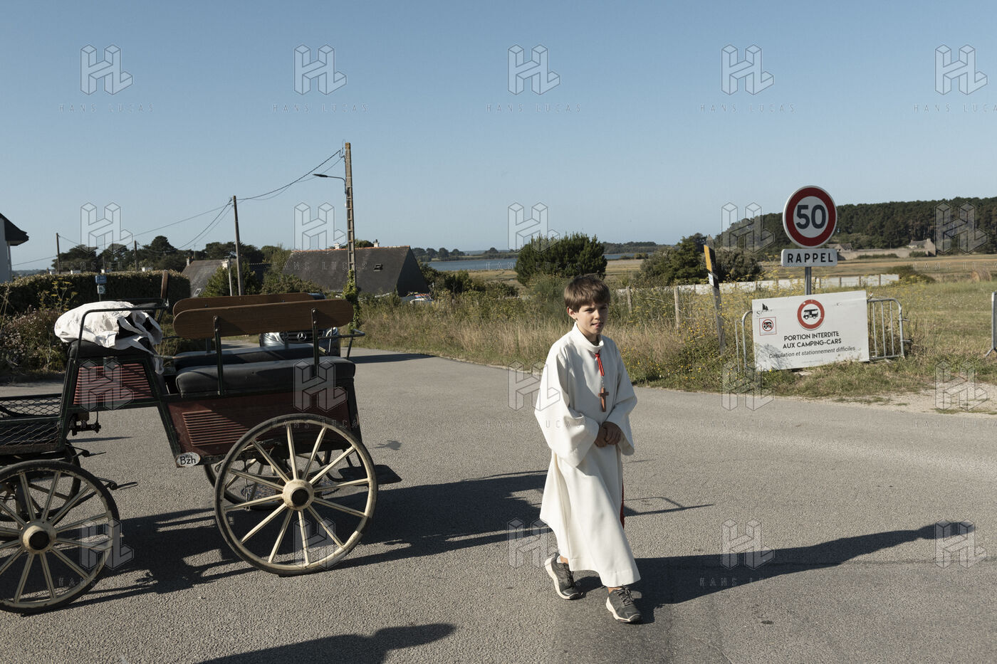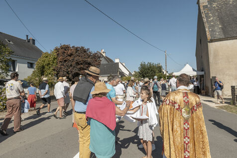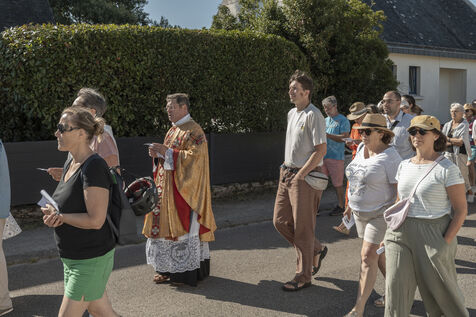 40 years of the pardon of Kerarden in the town of Séné in Morbihan, this Catholic procession from the calvert to the church of Kerarden in the center of the village, the priest as well as many faithful make this march, men, women children, a beautiful sunny day in Brittany with the Sunday mass in focus.