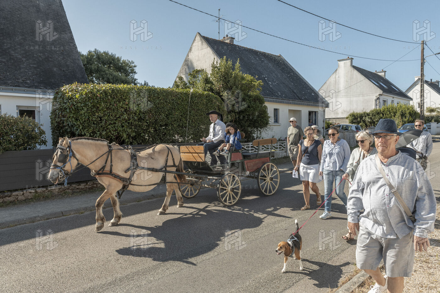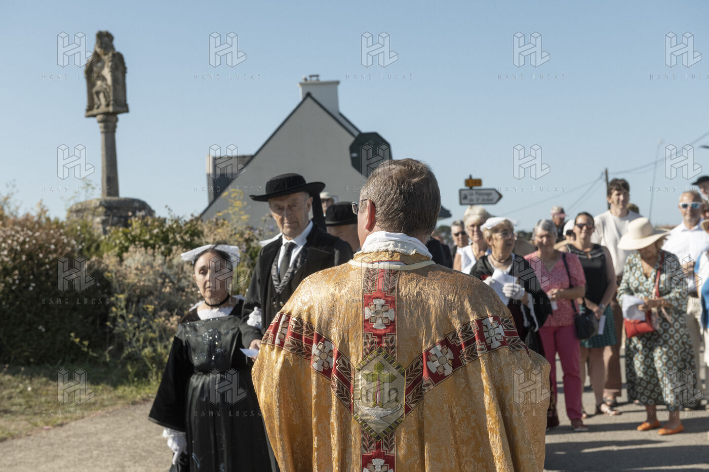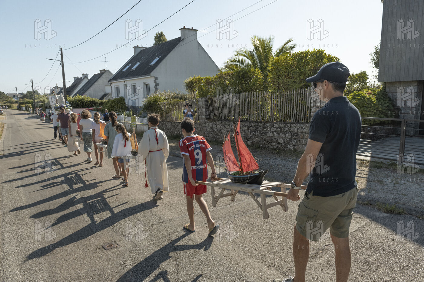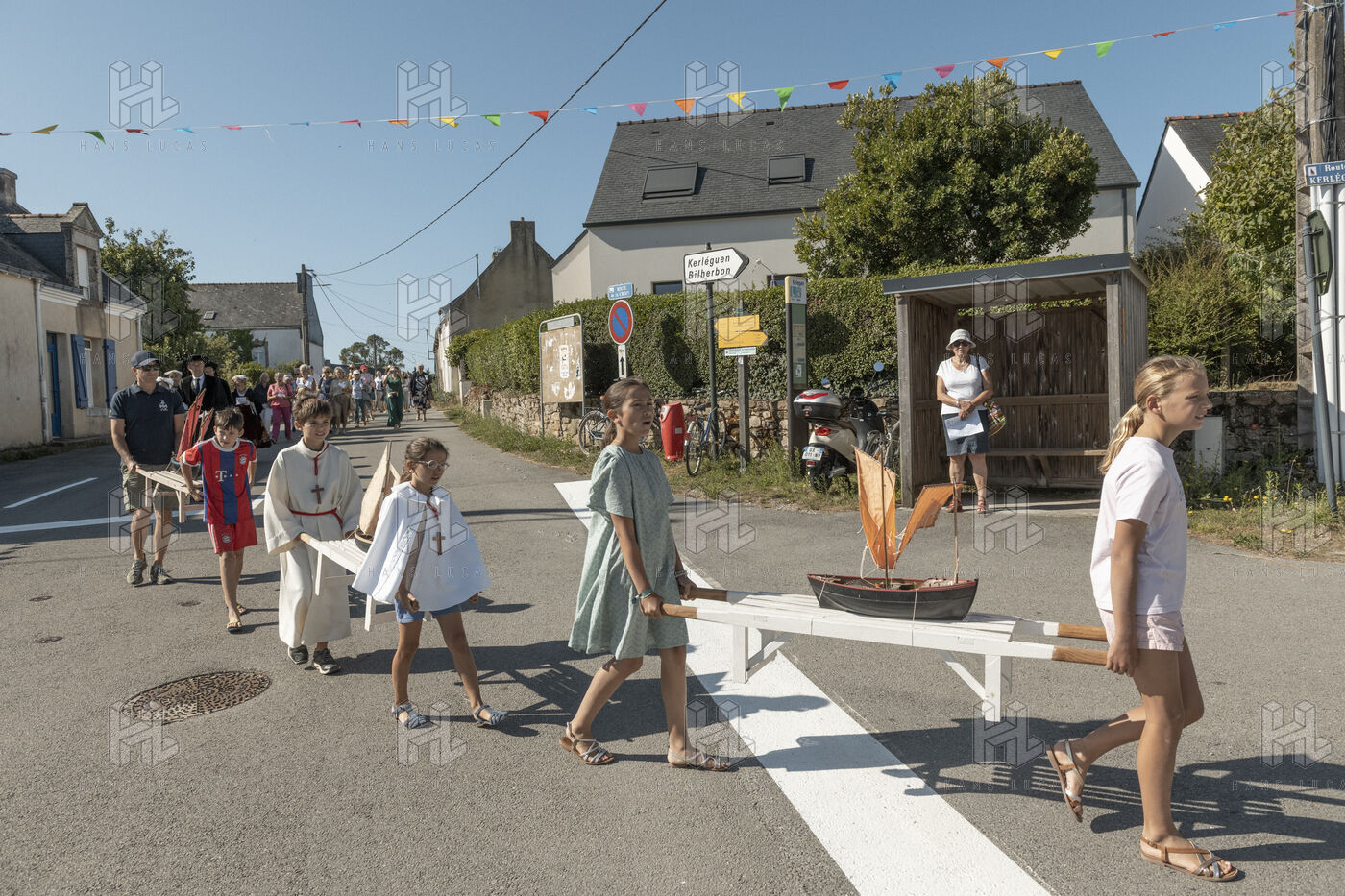 40 years of the pardon of Kerarden in the town of Séné in Morbihan, this Catholic procession from the calvert to the church of Kerarden in the center of the village, the priest as well as many faithful make this march, men, women children, a beautiful sunny day in Brittany with the Sunday mass in focus.