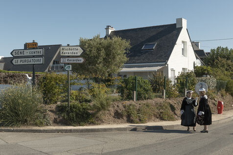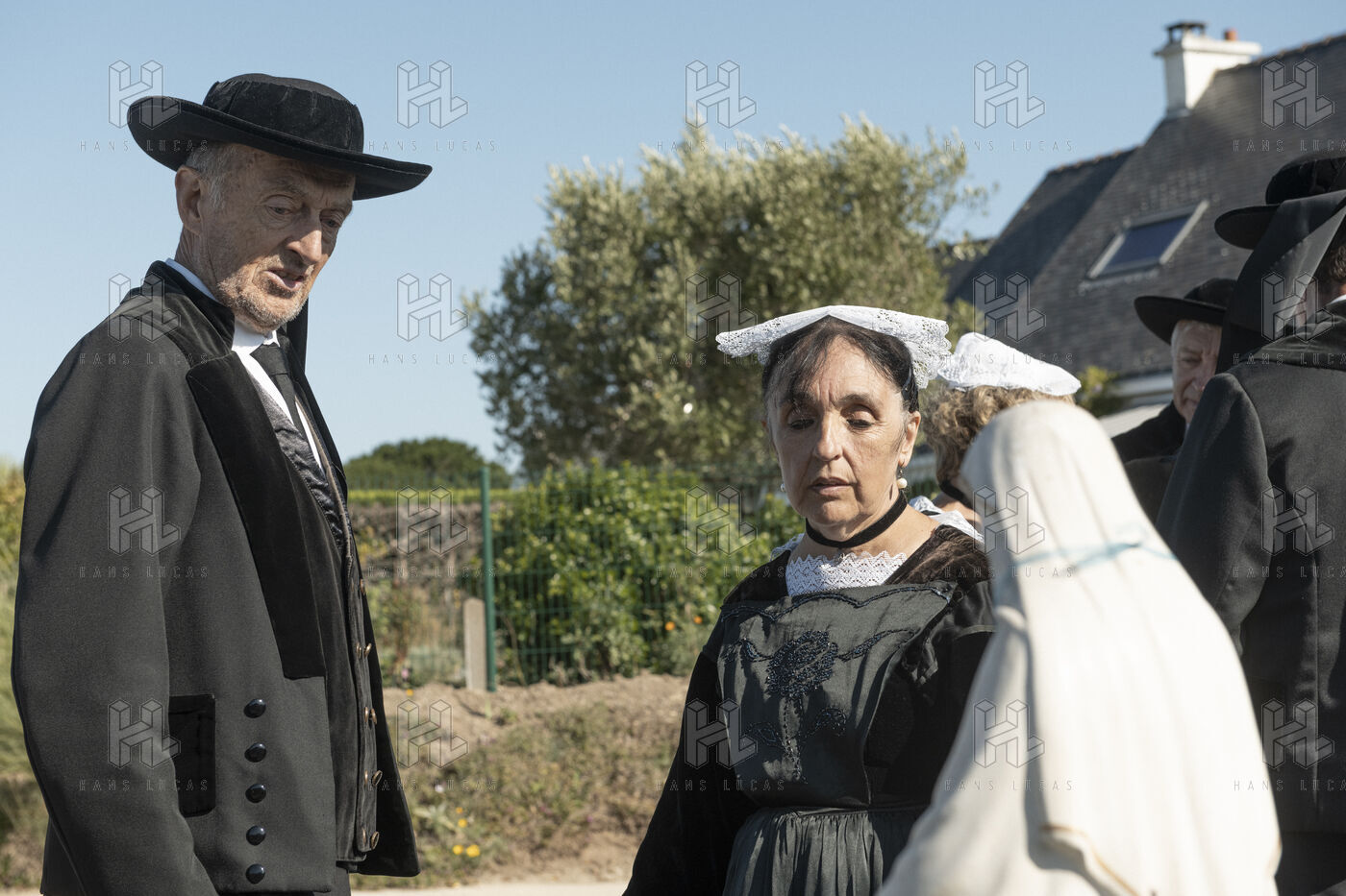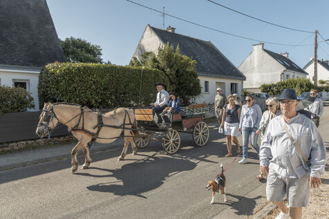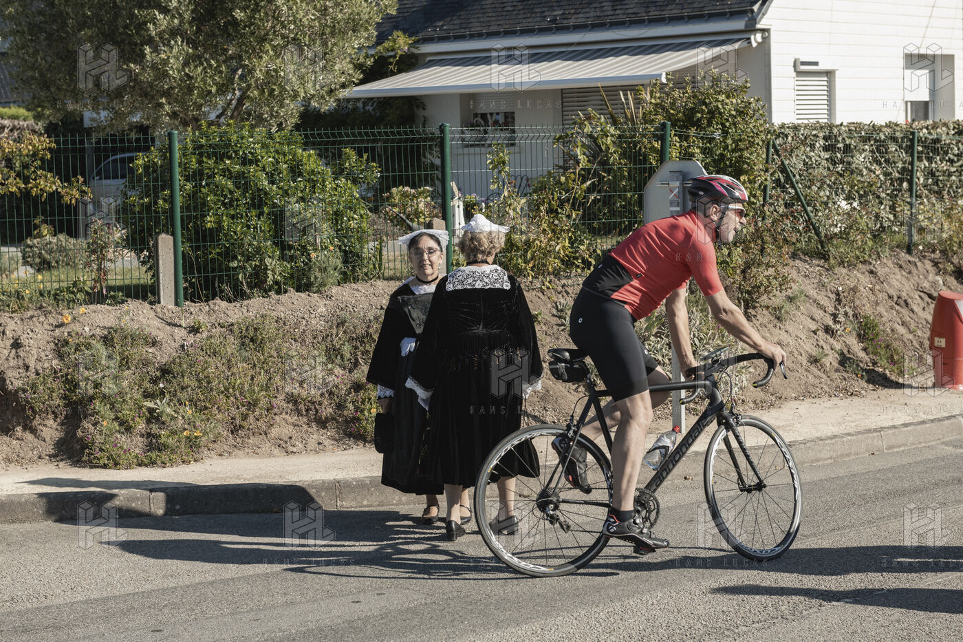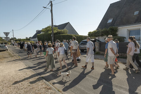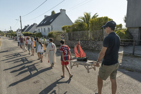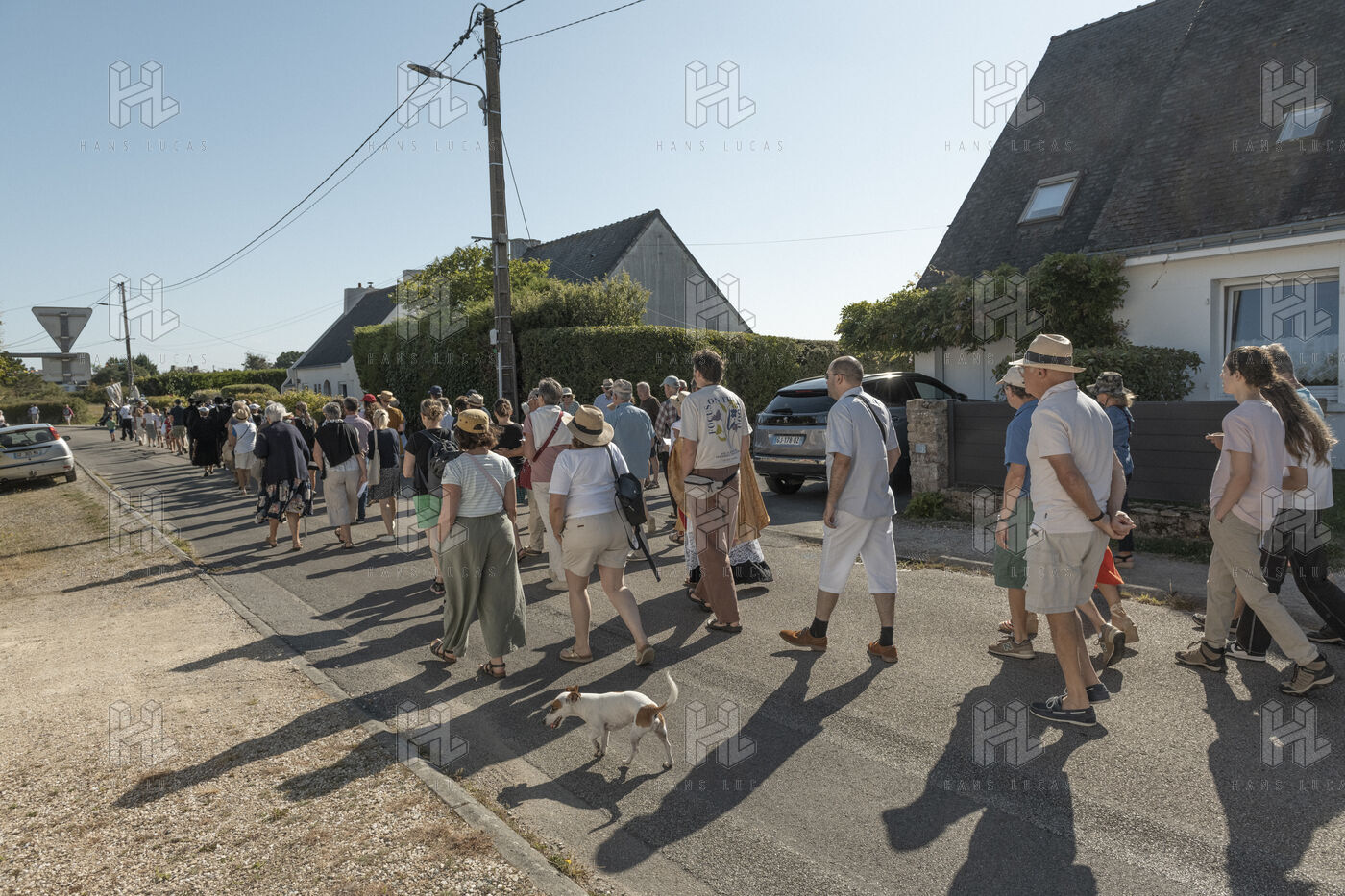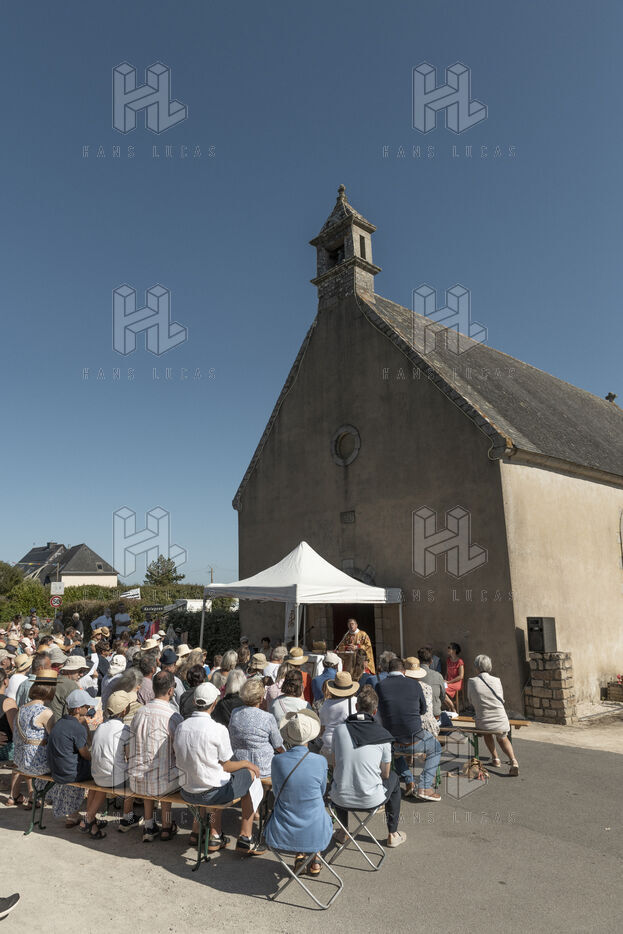 40 years of the pardon of Kerarden in the town of Séné in Morbihan, this Catholic procession from the calvert to the church of Kerarden in the center of the village, the priest as well as many faithful make this march, men, women children, a beautiful sunny day in Brittany with the Sunday mass in focus.