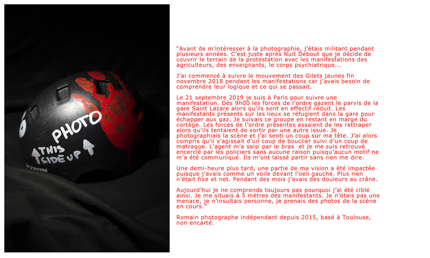 These images and testimonies are not the fruit of an imagination or a fiction but very real and lived. Without doing an exhaustive inventory, we could almost see it as a cabinet of curiosities as there are astonishing things that photographers, reporters, journalists, professionals, students, inset, non-inset enthusiasts carry on them to protect their physical integrity during the demonstrations in France for more than a year.