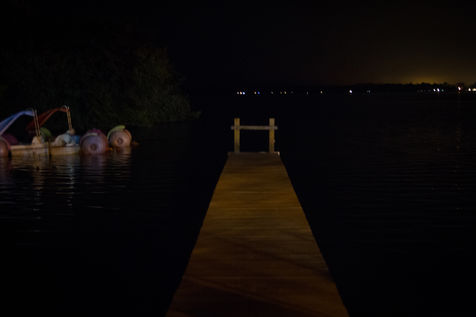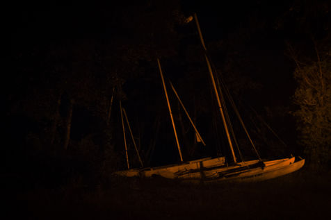 La période d'août est généralement celle où les touristes affluent dans Les Landes mais à cette heure du soir: les bateaux sont sans les voiles, le silence règne autour du lac malgré la présence de quelques promeneurs. Le calme, que j'y constate, encourage à la déambulation nocturne où seul l'éclairage indirect confère ces clairs-obscurs très picturaux aux objets, au lieu.