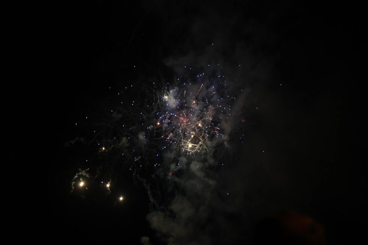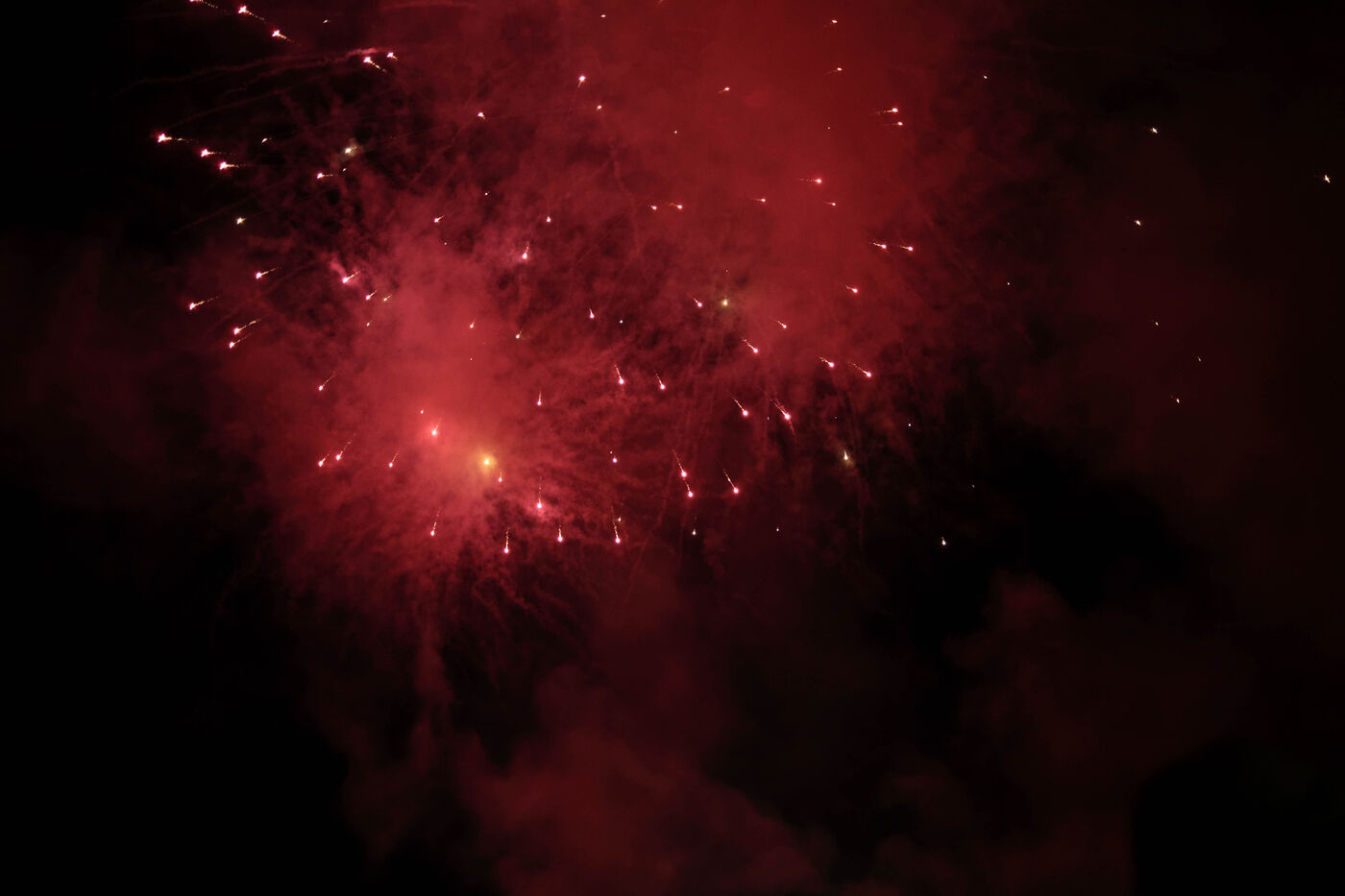 Je ne me suis pas évertuée à capter les rosaces colorées du feu d'artifice auquel j'ai assisté dans les landes au bord du lac de Léon mais plutôt à capter les retombées des feux. J'assiste à un spectacle de pluie d'étoiles et de constellations où la fumée et les scintillements confèrent une vision presque magique.