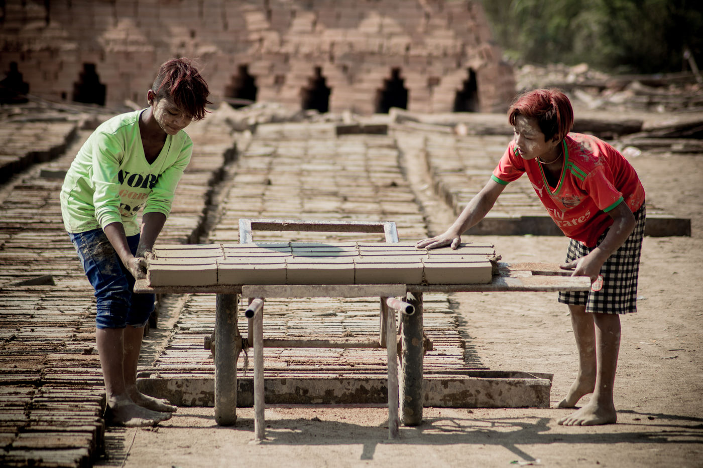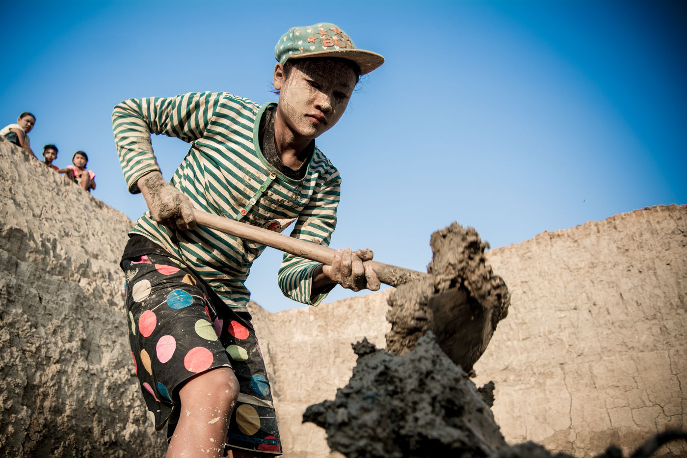 Un champ de briques attend à être séché. Des habitations de fortunes, éphémères, sont venues marquer la limite d?une carrière d?argile à la sortie de Hpa-An, en Birmanie. Des coups de pioches rythment l?exploitation, quand la rotation des porteuses en fait la danse. Nous sommes au c?ur d?une communauté d?une trentaine de familles, se retrouvant chaque année pour une saison de six mois, dans la usine de briques. Ici, chaque membre à son utilité dans la chaîne de productions, quand l?âge définit le poste. Si cette exploitation donne du travail aux plus jeunes, elle l?interdit aux moins de 13 ans, offre deux jours de repos par semaine et restreint la plage horaire. Des règles bienvenues pour une enfance aux pieds d?argile. En 2013, 168 M d?enfants dans le monde seraient concernés par le travail, dont 85 Millions dans des conditions dangereuses selon le Bureau International du Travail