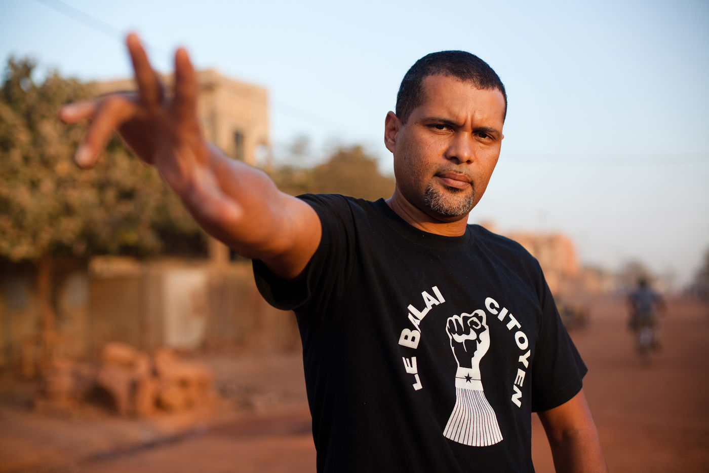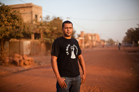 L'artiste musicien Smockey, posant en 2014 dans son quartier, où il tient un studio d'enregistrement nommé Abazon. Rappeur, producteur, Smockey est aussi un des membres fondateur du mouvement de la société civile Le Balai Citoyen, qui a été un fer de lance de la mobilisation dans les quartiers les jours précédents l'insurrection populaire du 30 et 31 octobre 2014.