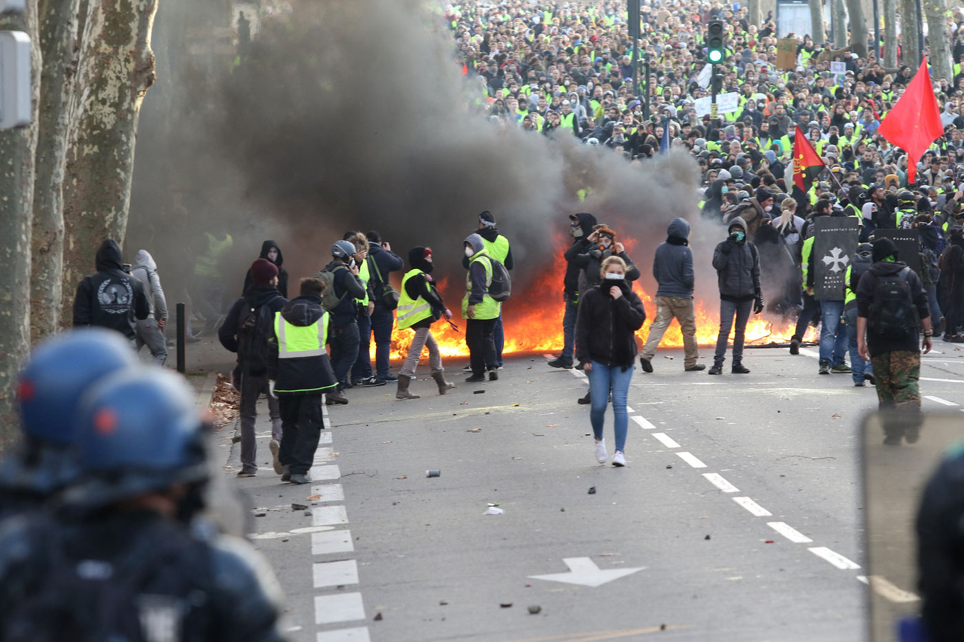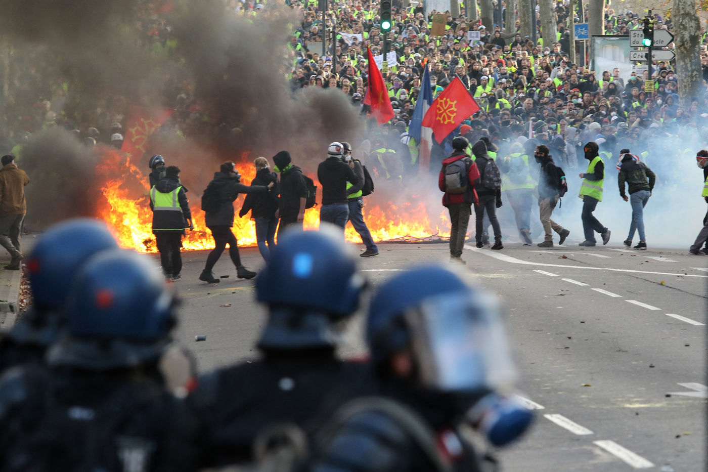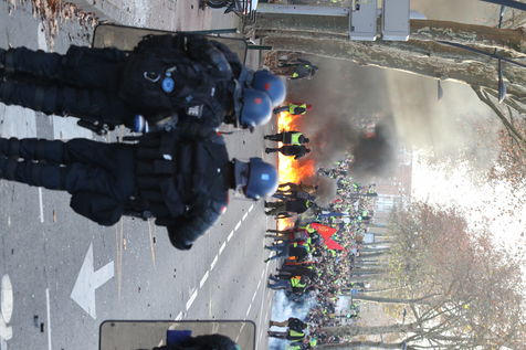 Clashes between the police and a group of yellow vests that came to grips with the demonstration during the climate march movement of "yellow vests", a movement of protest by French citizens that appeared on social networks against the increase in fuel taxes, tax increases and against the government and the Macron president. Toulouse, France - December 8, 2018.