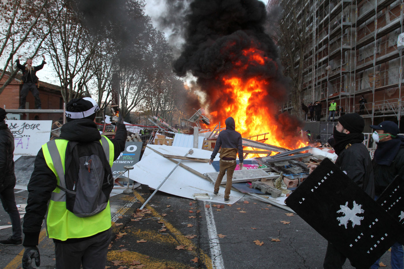 Affrontements entre la police et avec un groupe de gilets jaunes venu en découdre lors de la manifestation de la marche du climat et l'acte IV du mouvement des gilets jaunes mouvement de contestation des citoyens francais apparu sur les reseaux sociaux contre la hausse des taxes sur les carburants, la hausse des impots, le pouvoir d'achat contre le gouvernement et le president Macron. Toulouse, France - 8 Decembre 2018.