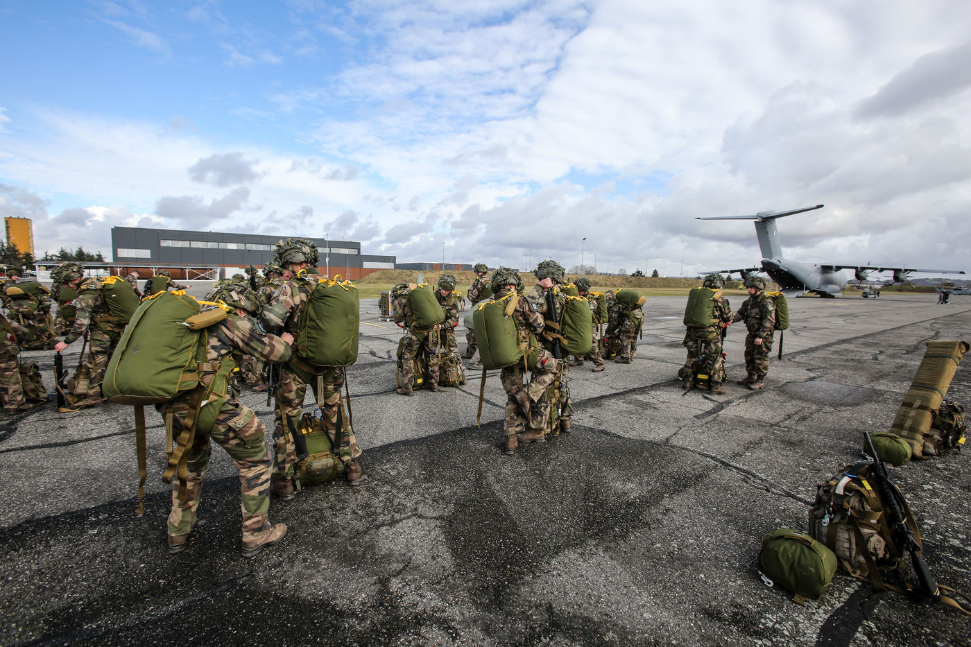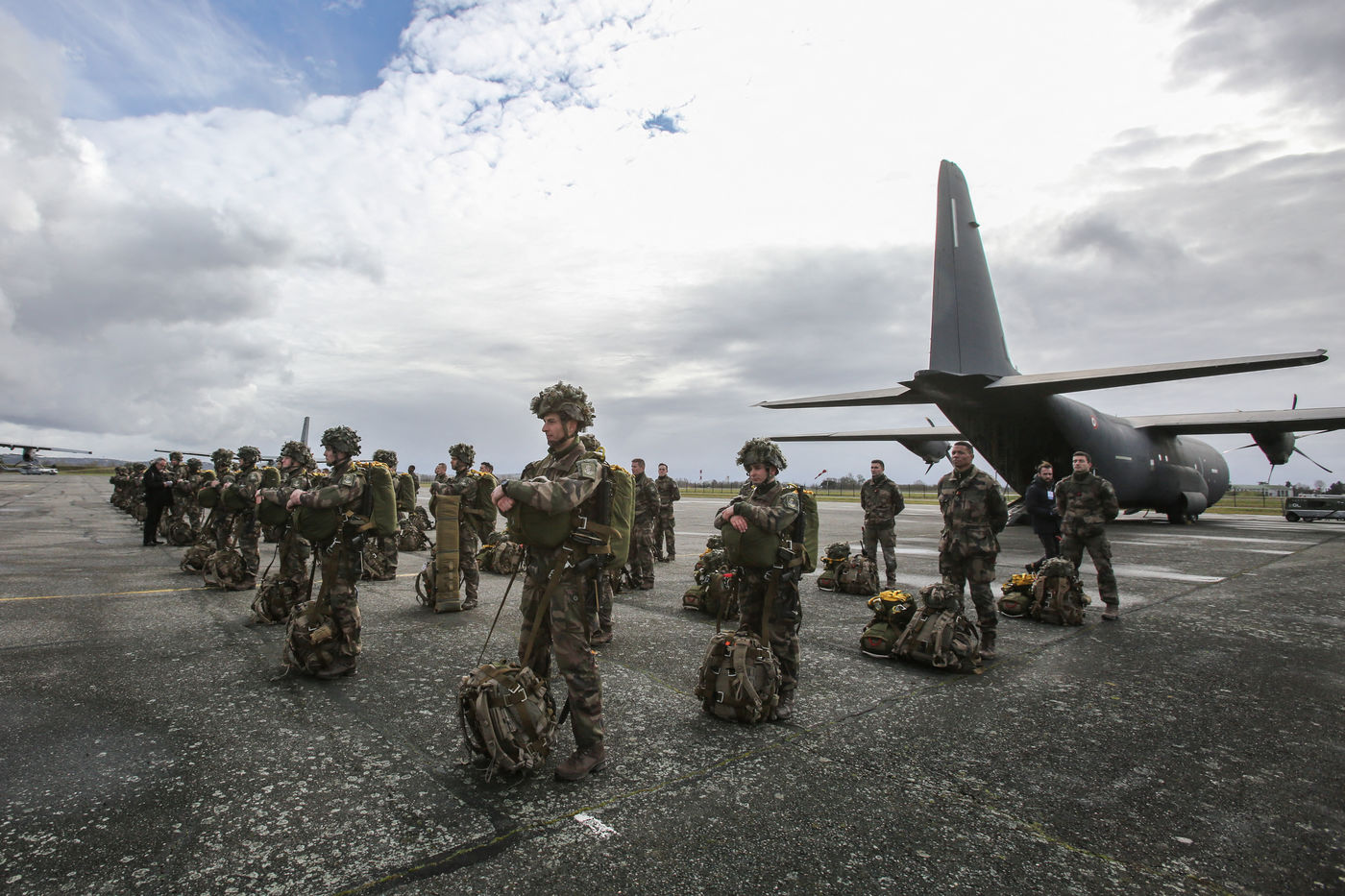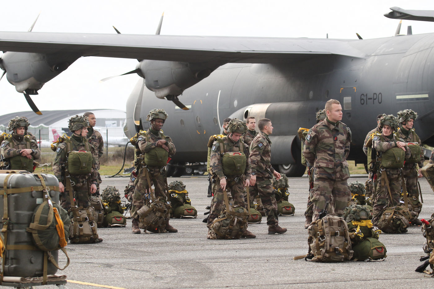 Soldats parachutiste de l'armée Francaise des troupes aéroportés de la 11 ème brigade parachutiste de Francazal sur le tarmac de la base aerienne militaire de Francazal.