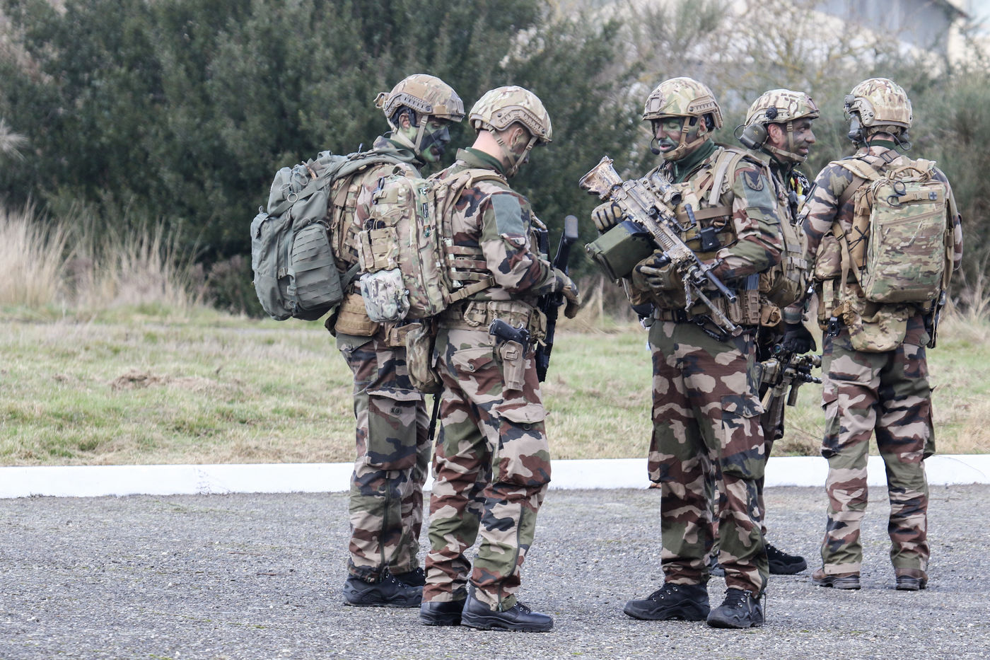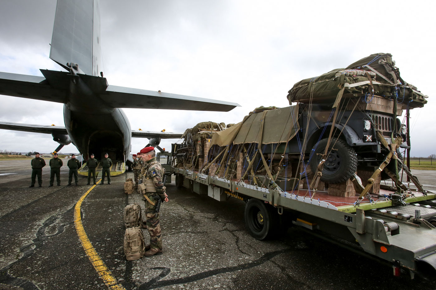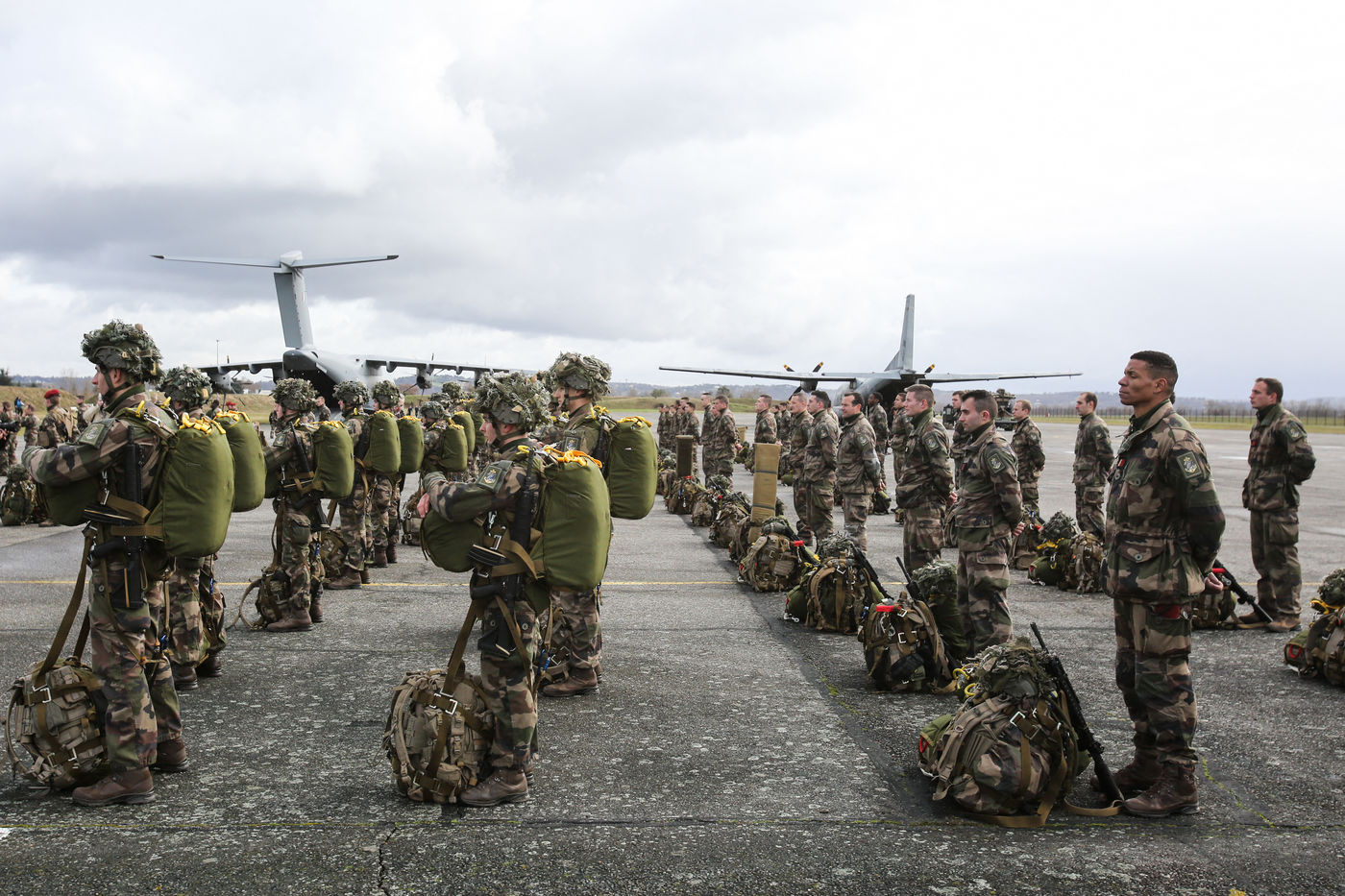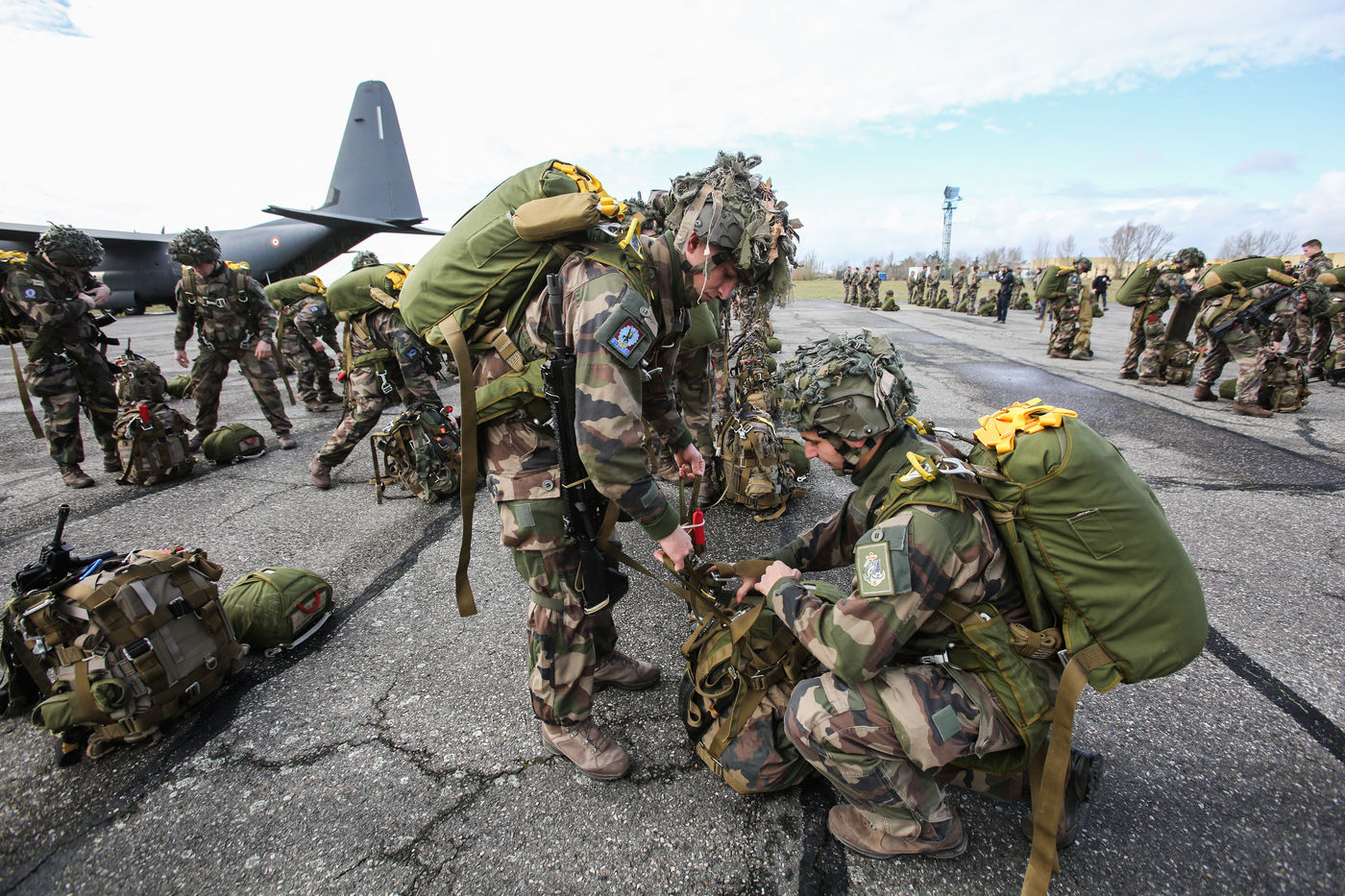 Soldats parachutiste de l'armée Francaise des troupes aéroportés de la 11 ème brigade parachutiste de Francazal sur le tarmac de la base aerienne militaire de Francazal.