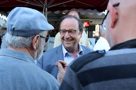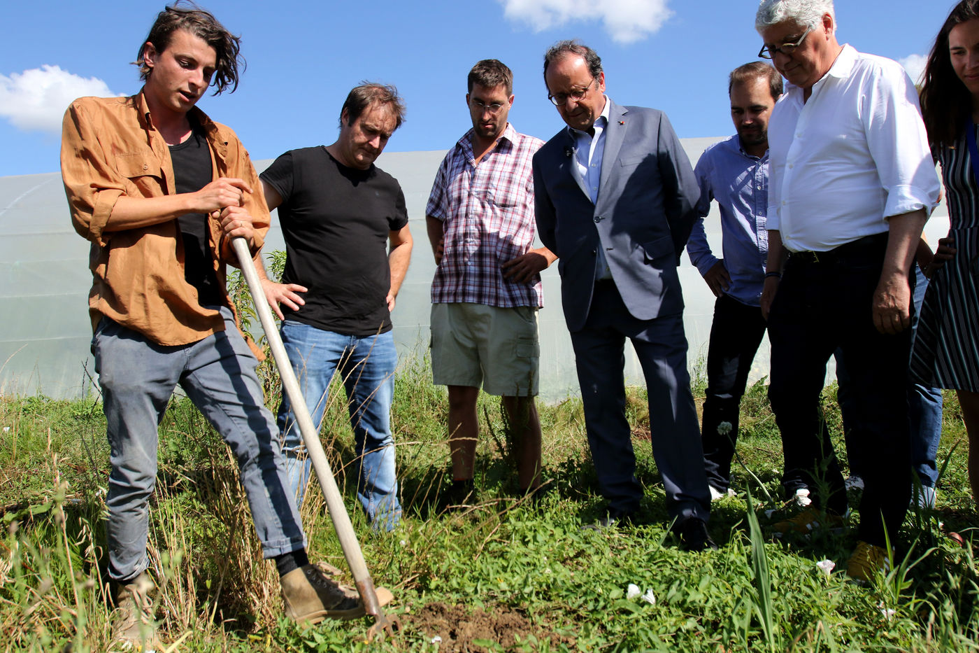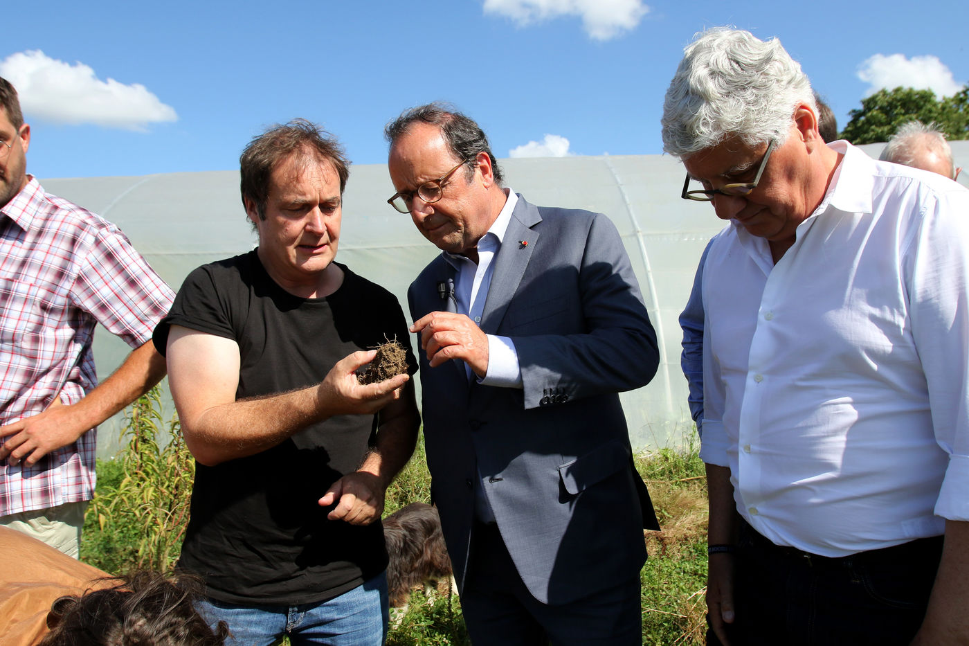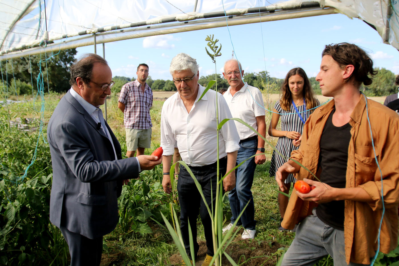 Francois Hollande, former President of the French Republic, visits an organic farm practising agroforestry . Marciac, France - July 28, 2019.