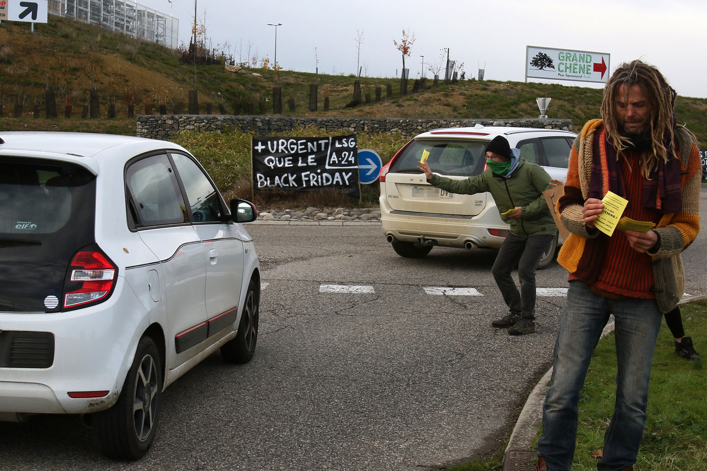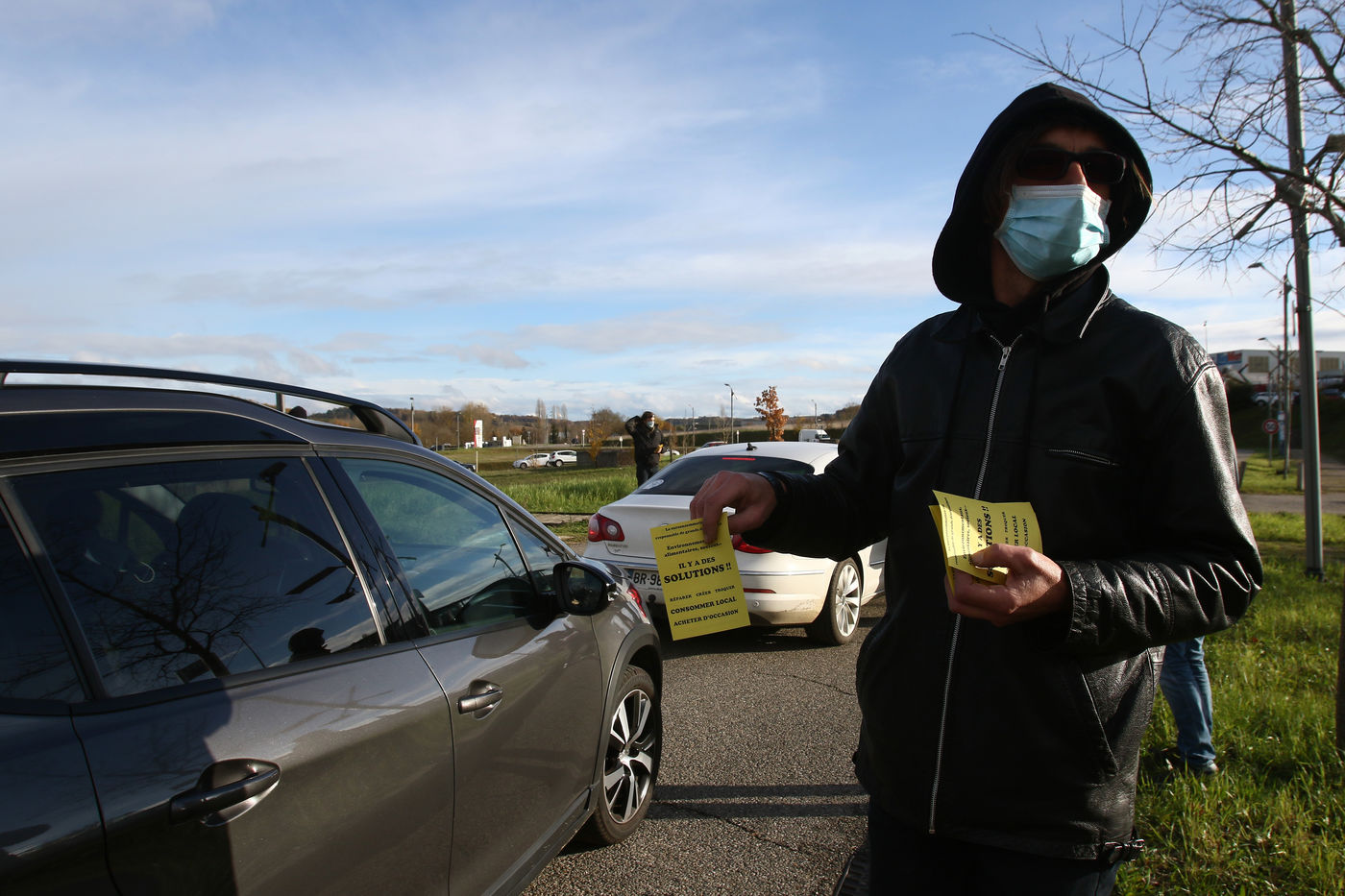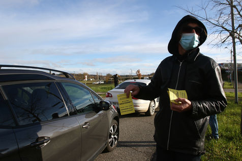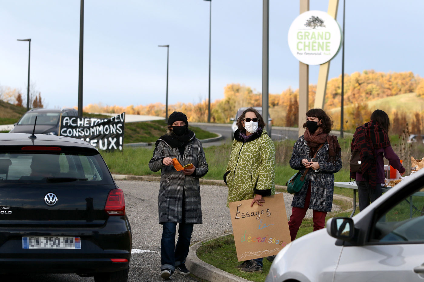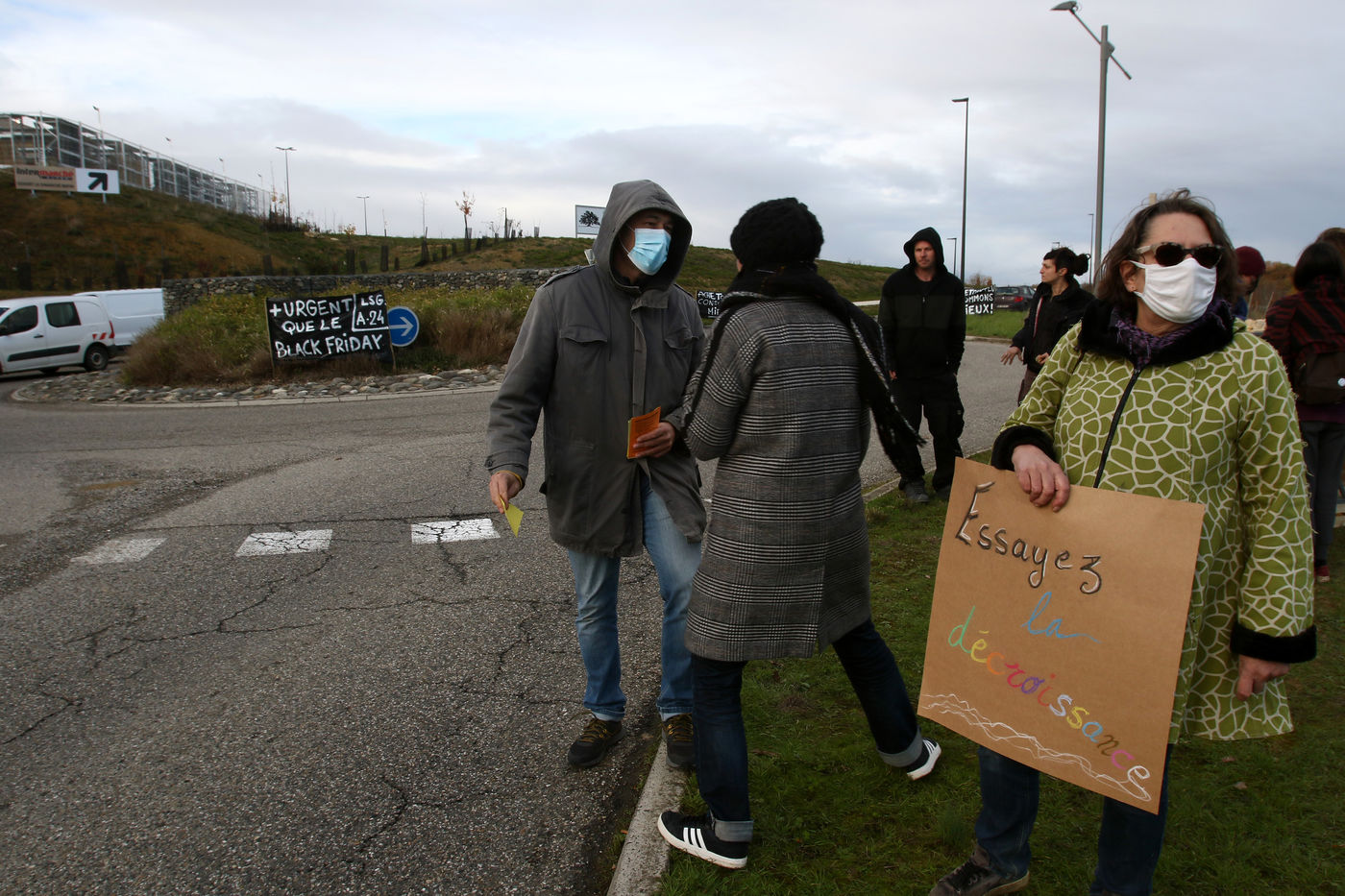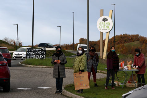 Protestation et tractage d'un collectif citoyens ecologiste aupres des consommateurs pour promouvoir une meilleure consommation locale au abord du centre commercial du Grand Chene a Auch le jour du Black Friday afin de denoncer la surconsommation lors de cette operation commerciale des marques avec des promotions et rabais de leur produits engendrant de la pollution. Auch, France - 04 Decembre 2020. Photographie par Sebastien Lapeyrere