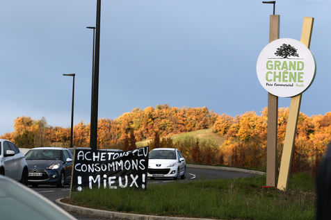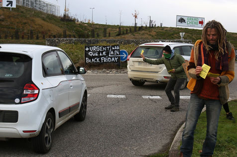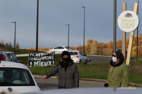 Protest operation of towing of a collective citizen ecologist with consumers to promote better local consumption at the approach of the Grand Chene mall in Auch on Black Friday in order to denounce the overconsumption during this commercial operation of brands with promotions and discounts of their products causing pollution. Auch, France - December 04, 2020. Photography by Sebastien Lapeyrere